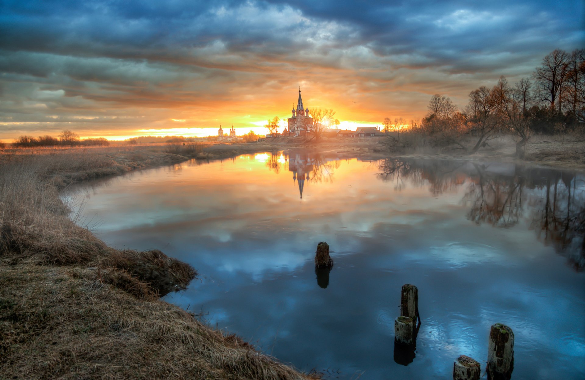 Kościół przed zbiornikiem wodnym na tle pomarańczowego świtu