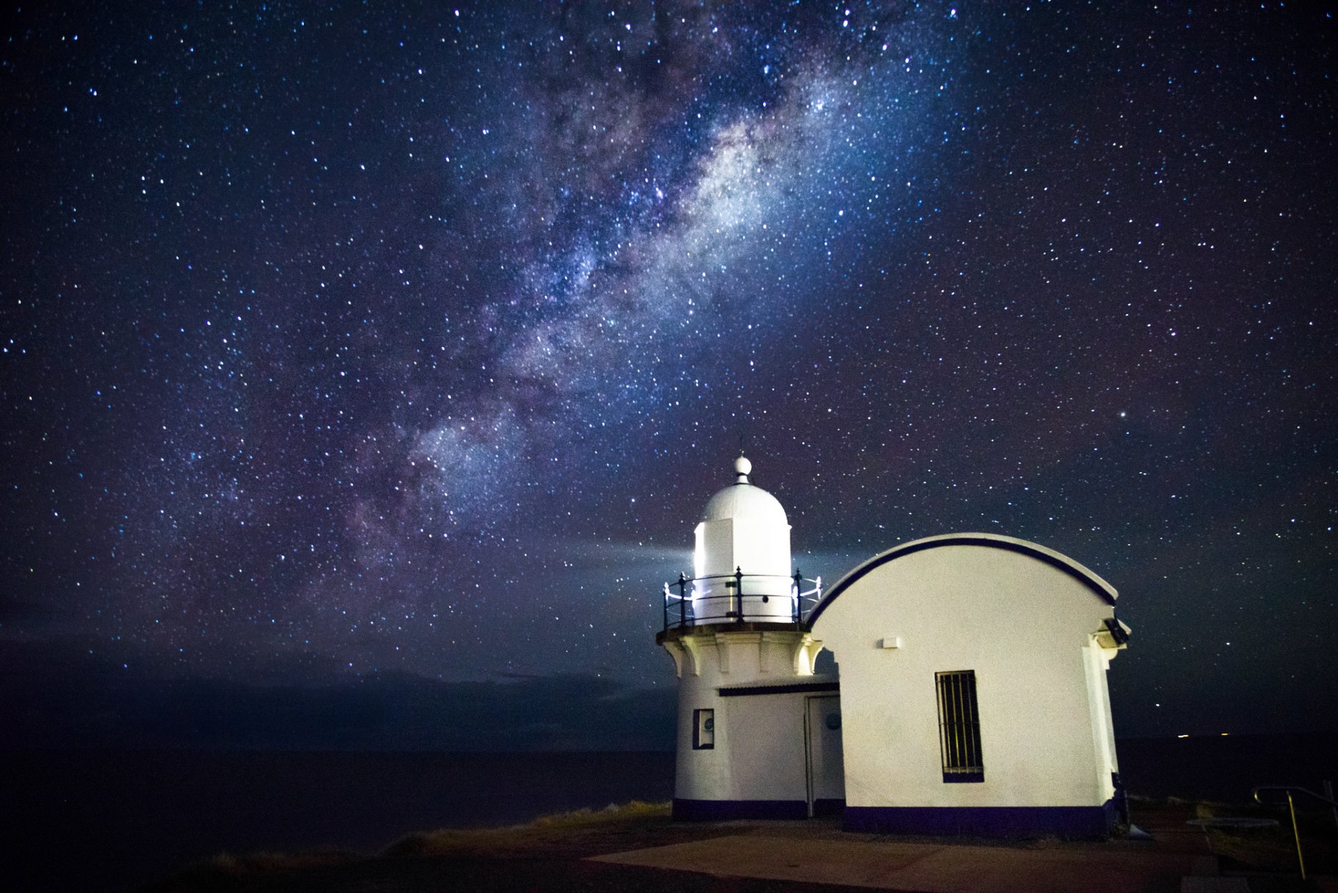 Latarnia morska stojąca nad morzem i czyste gwiaździste niebo