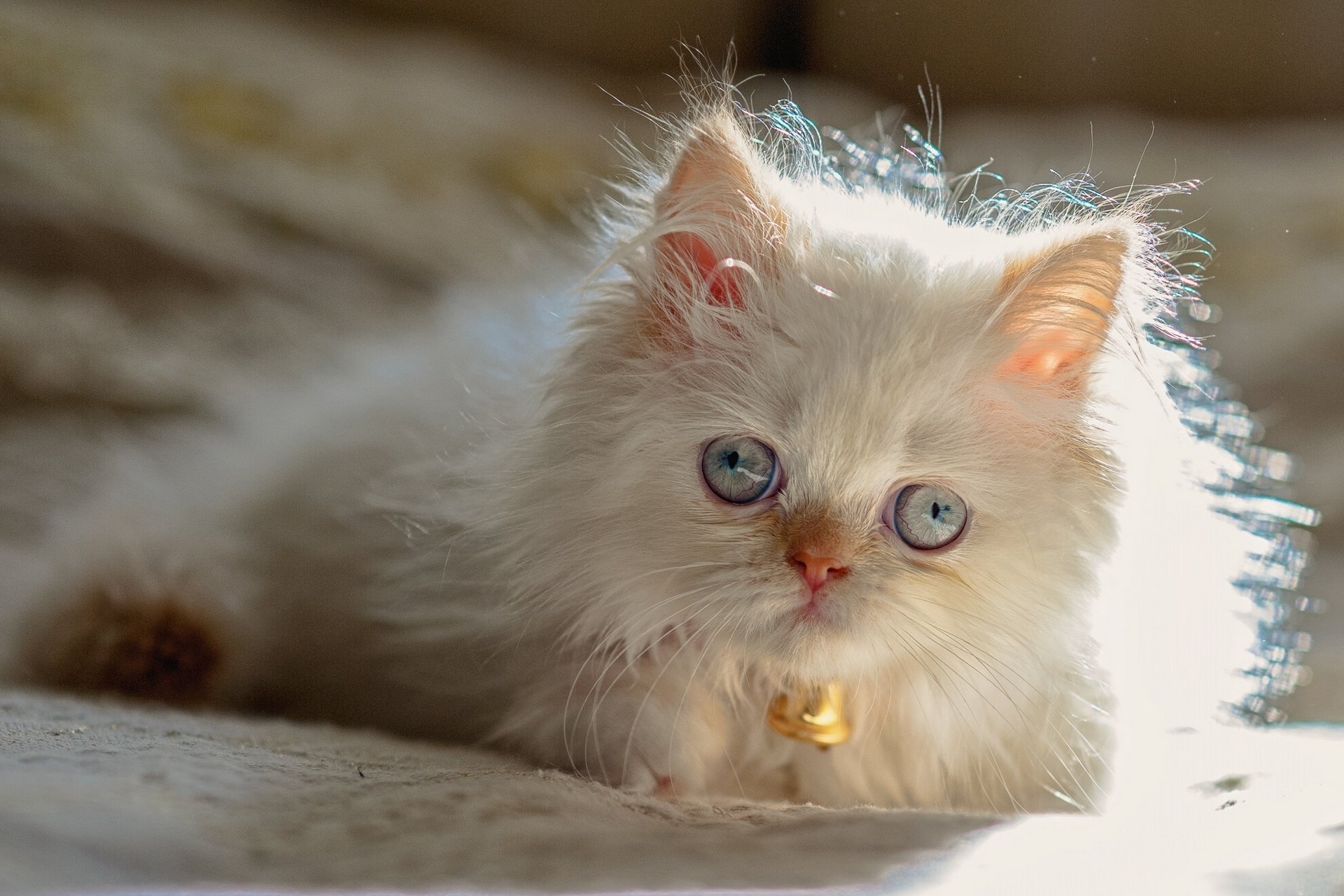 Biały zezowaty kotek z dzwonkiem na szyi