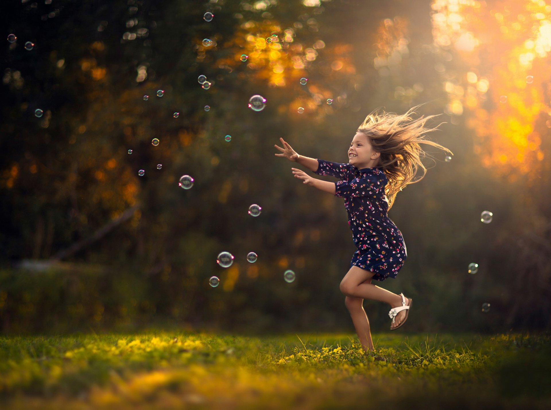 Dziewczyna siedzi na trawie i dmuchanie baniek mydlanych