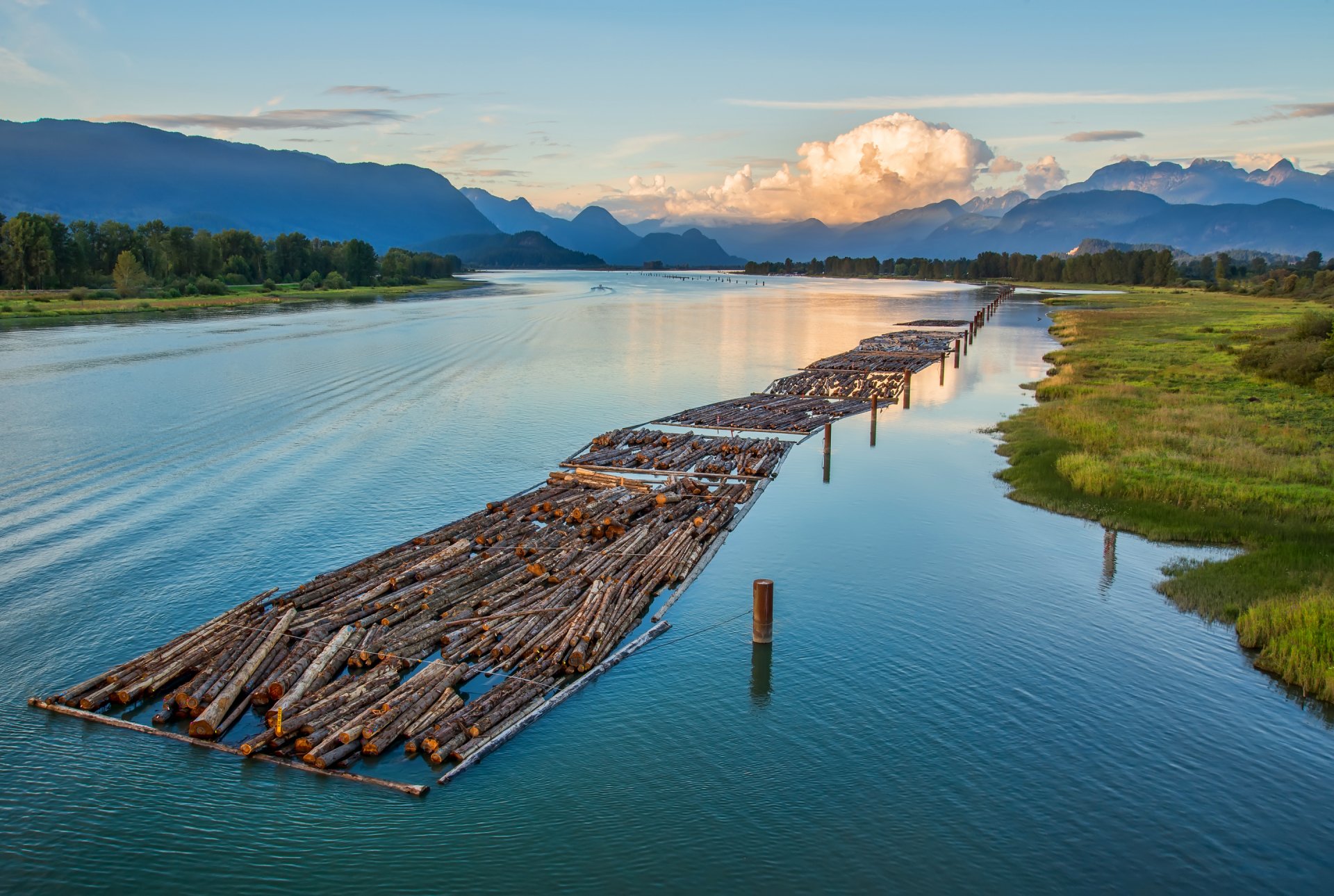 Dzienniki na wodzie w Kolumbii Brytyjskiej. Las i góry na horyzoncie