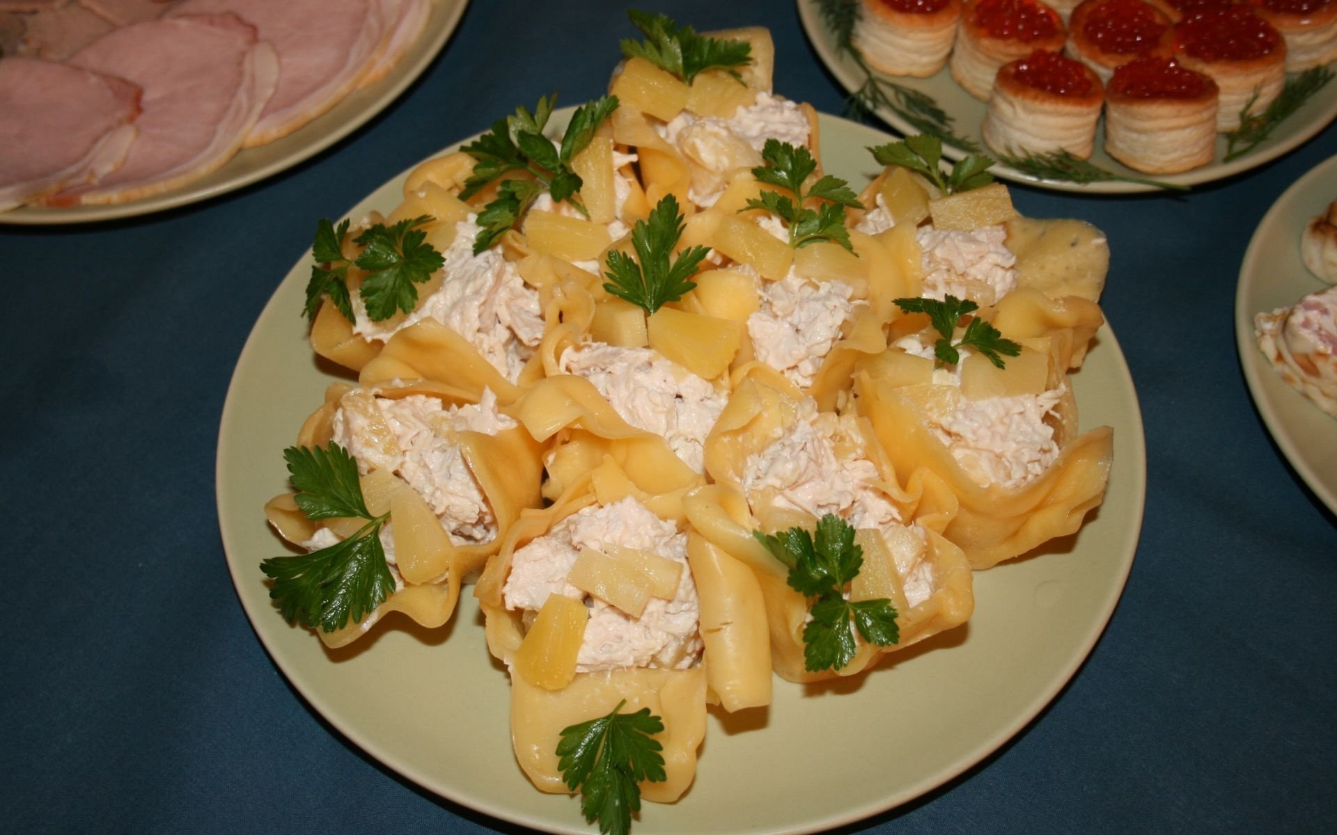 Sałatka z kurczakiem przyozdobiona natką pietruszki