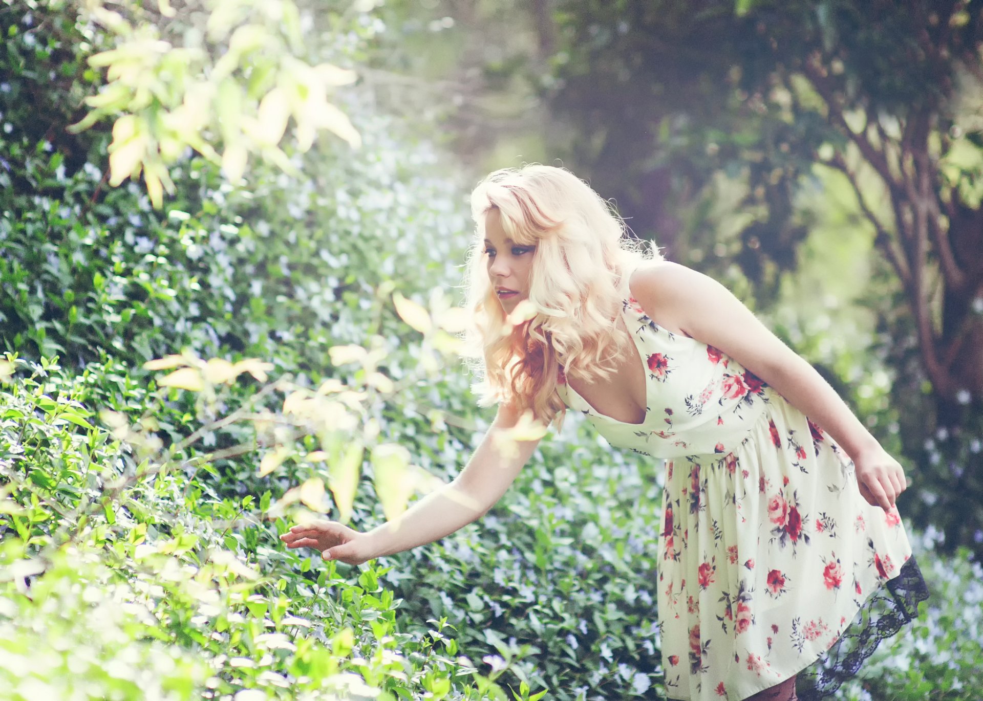 Dziewczyna w biało-niebieskiej sukience siedząca na wiklinowym krześle w kawiarni na chodniku