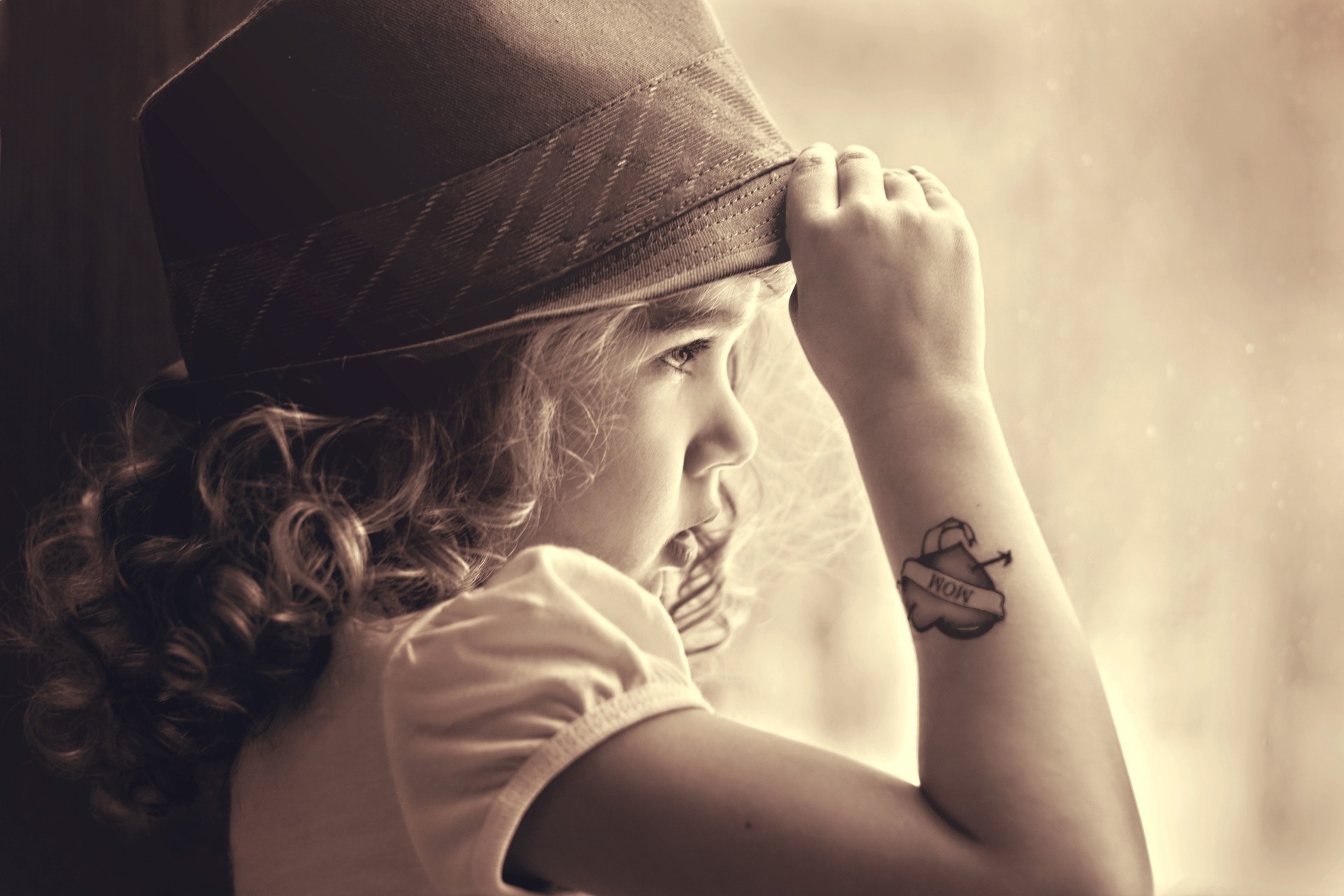 Mała dziewczynka w różowym berecie siedzi przy stole z piwoniami