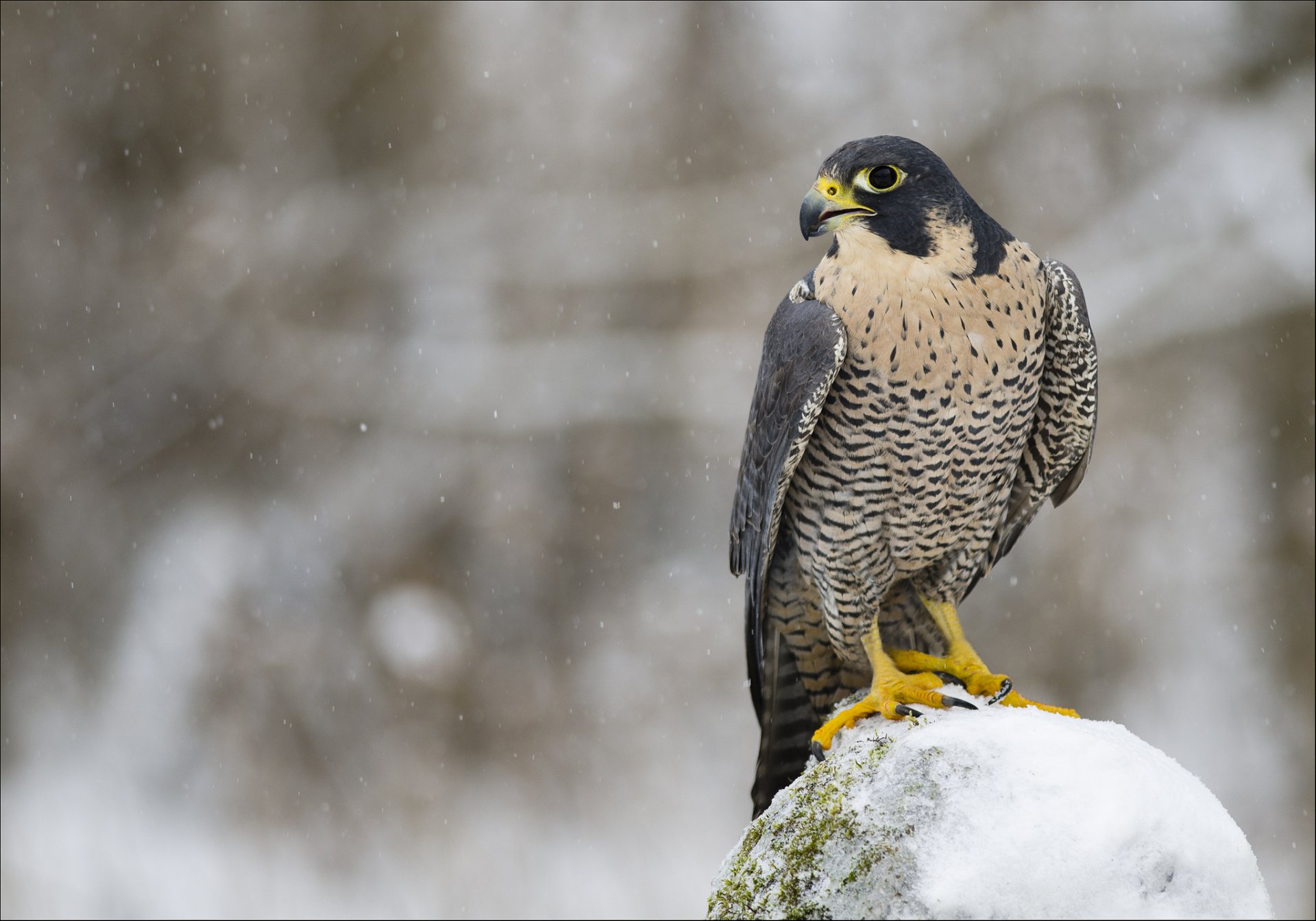 Sokół siedzi na skale pokrytej śniegiem