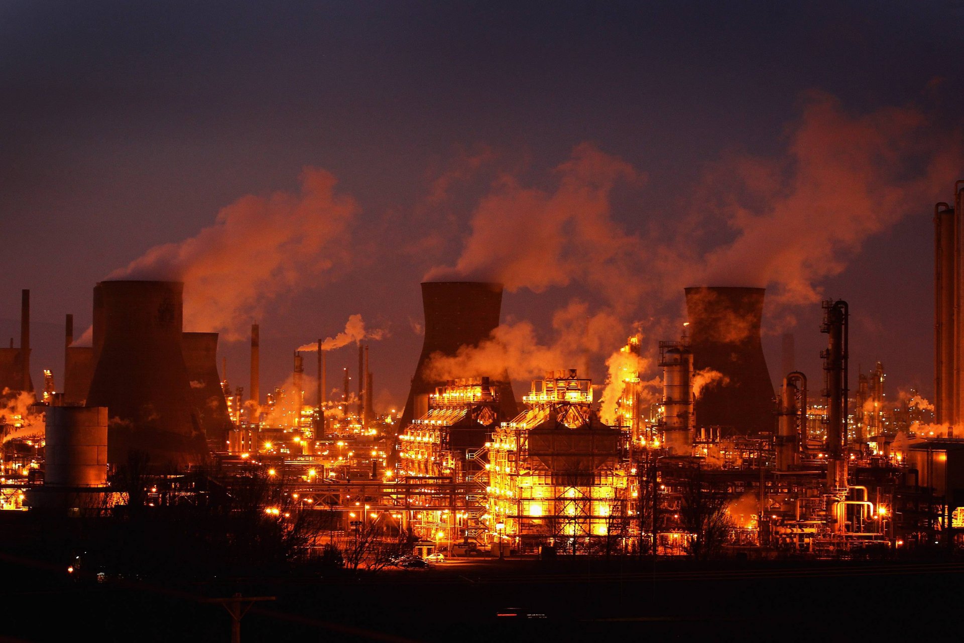 Nocne miasto i fabryka z włączoną iluminacją
