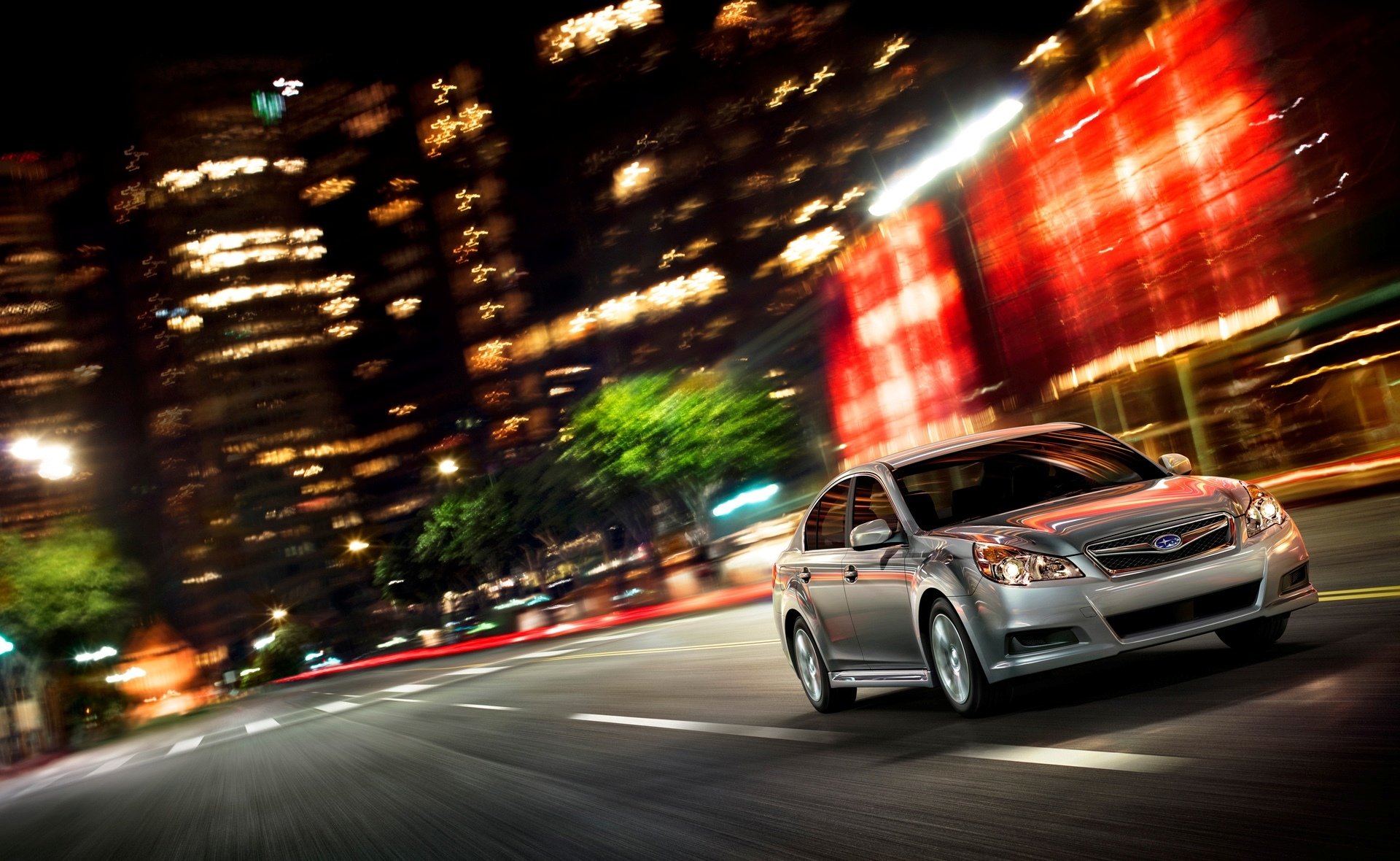 Niewyraźne tło wiejskiej drogi z samochodem Subaru