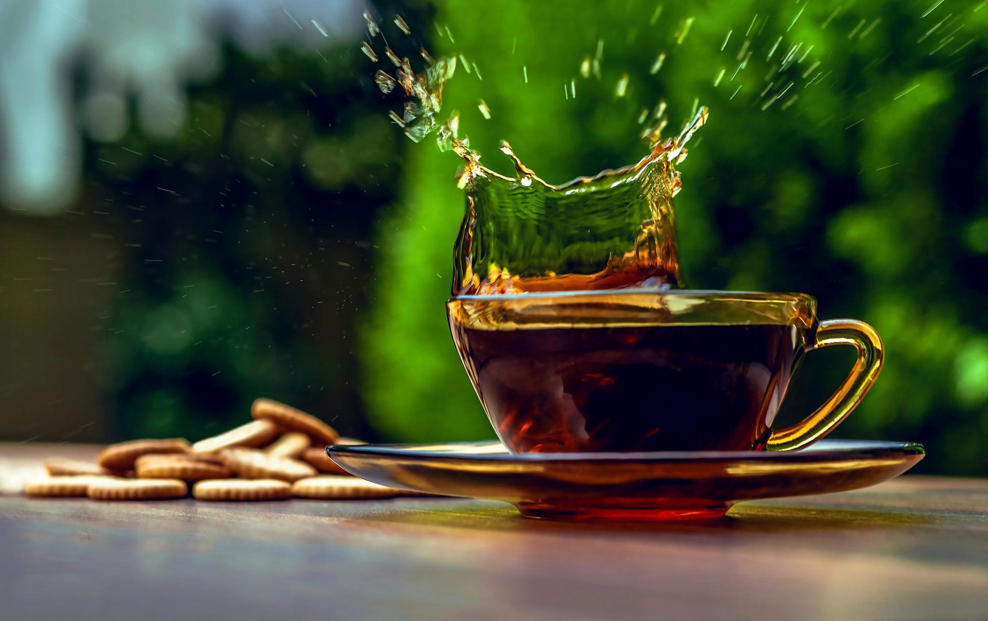 Herbata w filiżance na tle różowych kwiatów i deseru