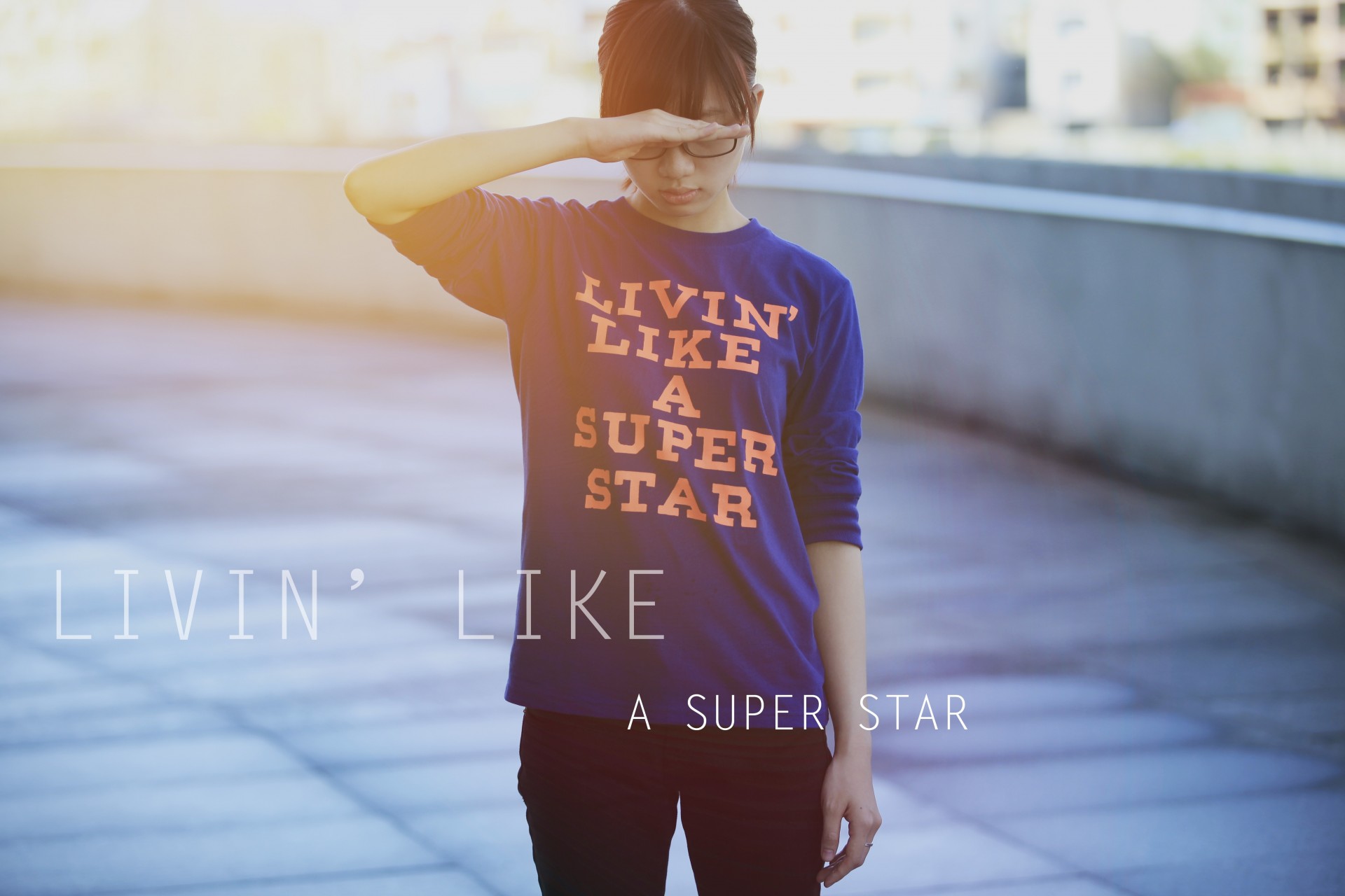 Dziewczyna w niebieskiej koszulce z napisami i czapce baseballowej w promieniach jasnego słońca