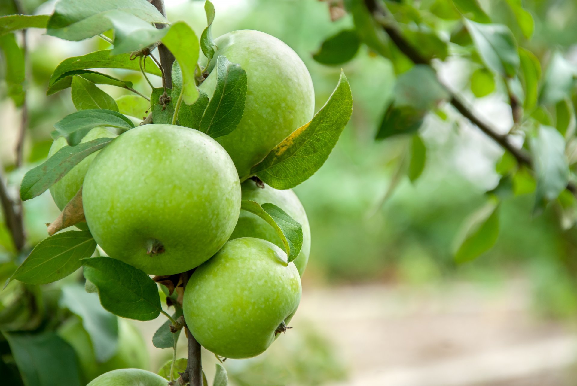 Zielone jabłka wiszą na gałęzi