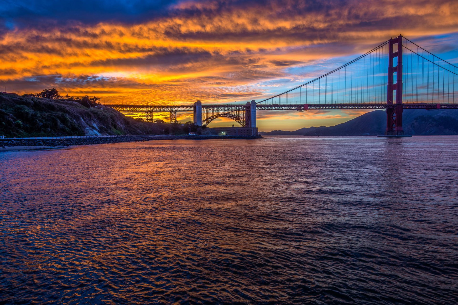 Most Golden Gate nad cieśniną o zachodzie słońca