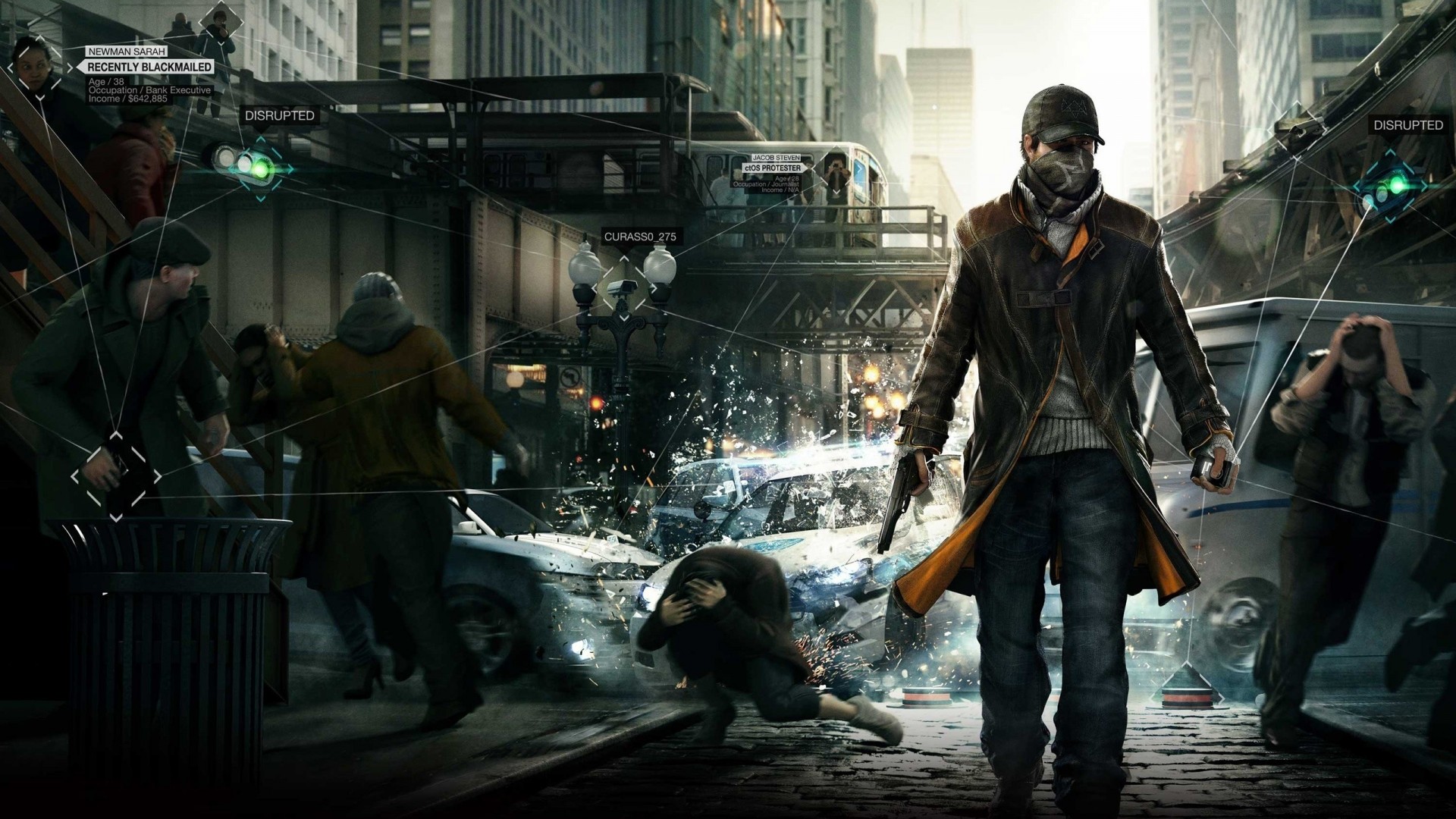 Aiden Pierce w tłumie z bronią