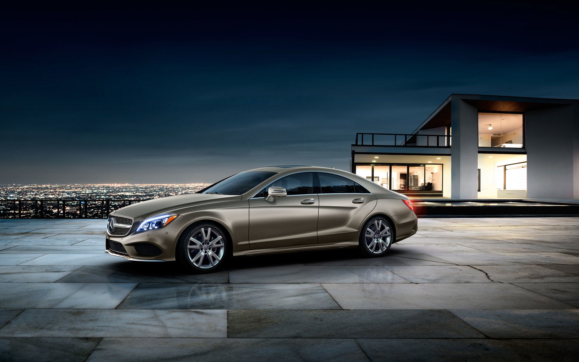 Mersedes w kolorze ciemnego złota na tle rezydencji