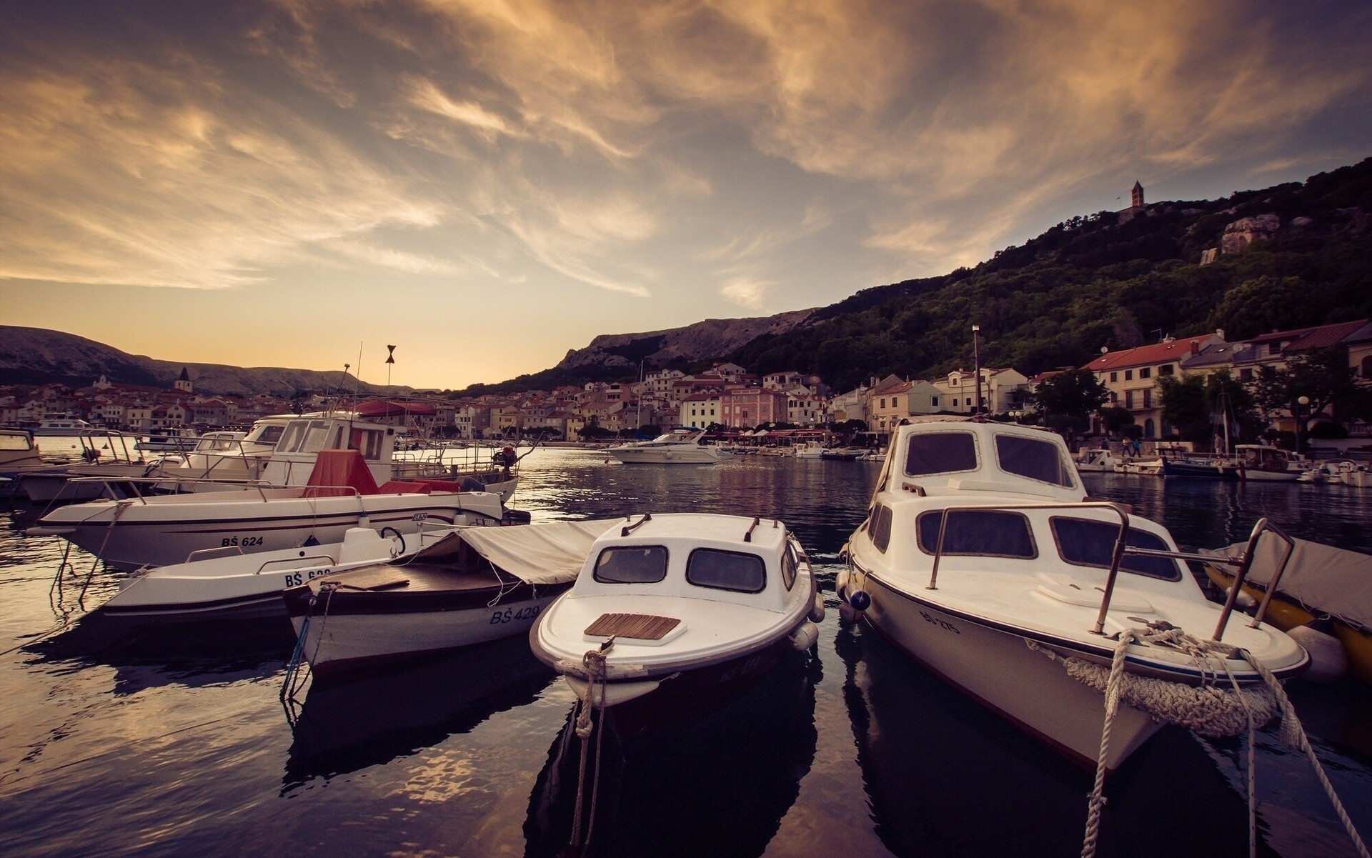 Chorwacja zatoka z łodziami o zachodzie słońca