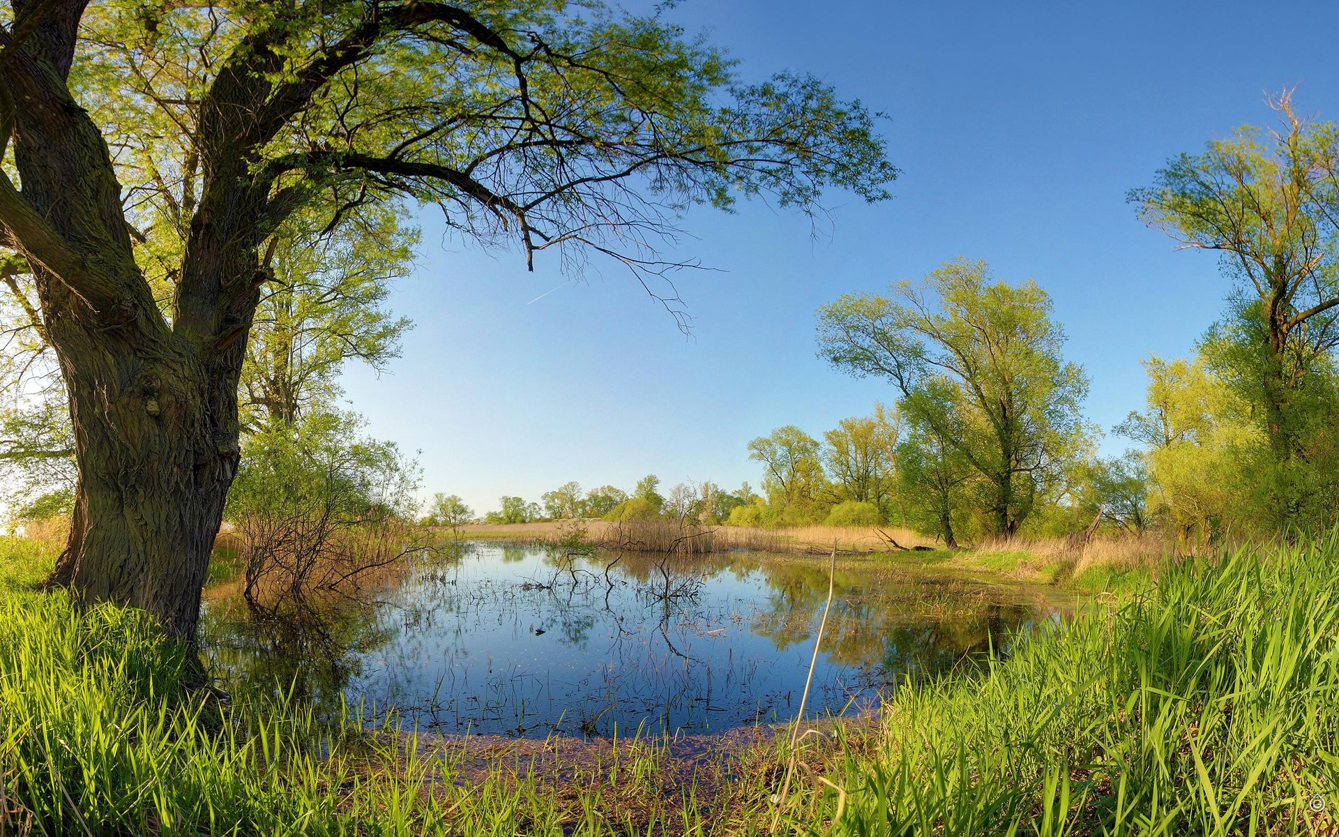 Wczesna jesień. Zielona trawa w parku. Duży staw z mostkiem