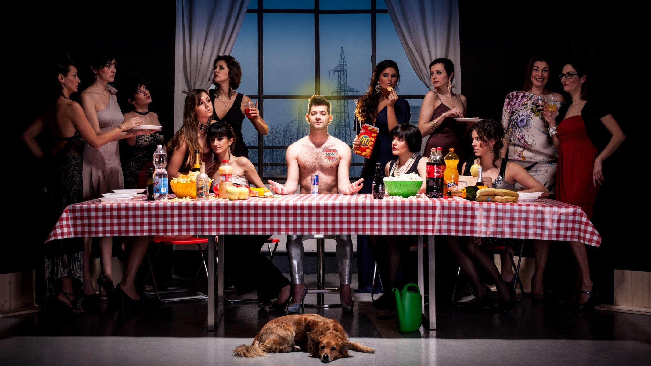 Facet w koszulce na wyspie wskazuje palcem na ziemięFacet w koszulce na wyspie wskazuje palcem na ziemię