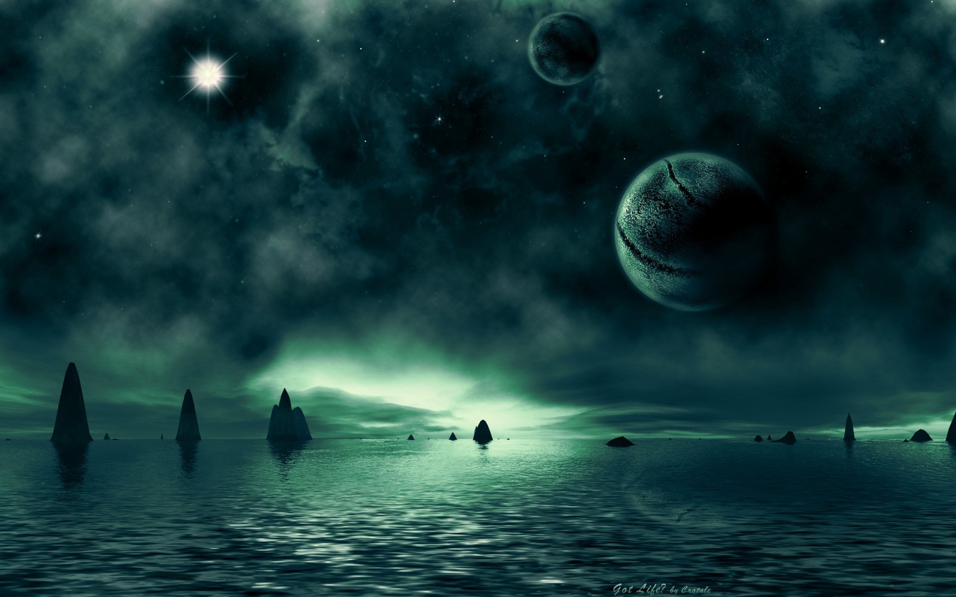 Planety nad skalistym morzem na tle burzowych chmurPlanety nad skalistym morzem na tle burzowych chmur