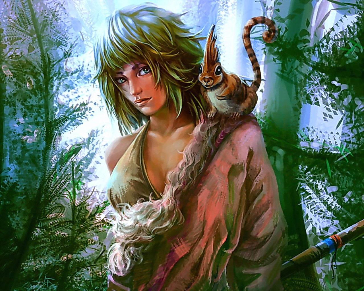 Dziewczyna łowczyni w leśnym gąszczu z przyjacielem wiewiórkąDziewczyna łowczyni w leśnym gąszczu z przyjacielem wiewiórką