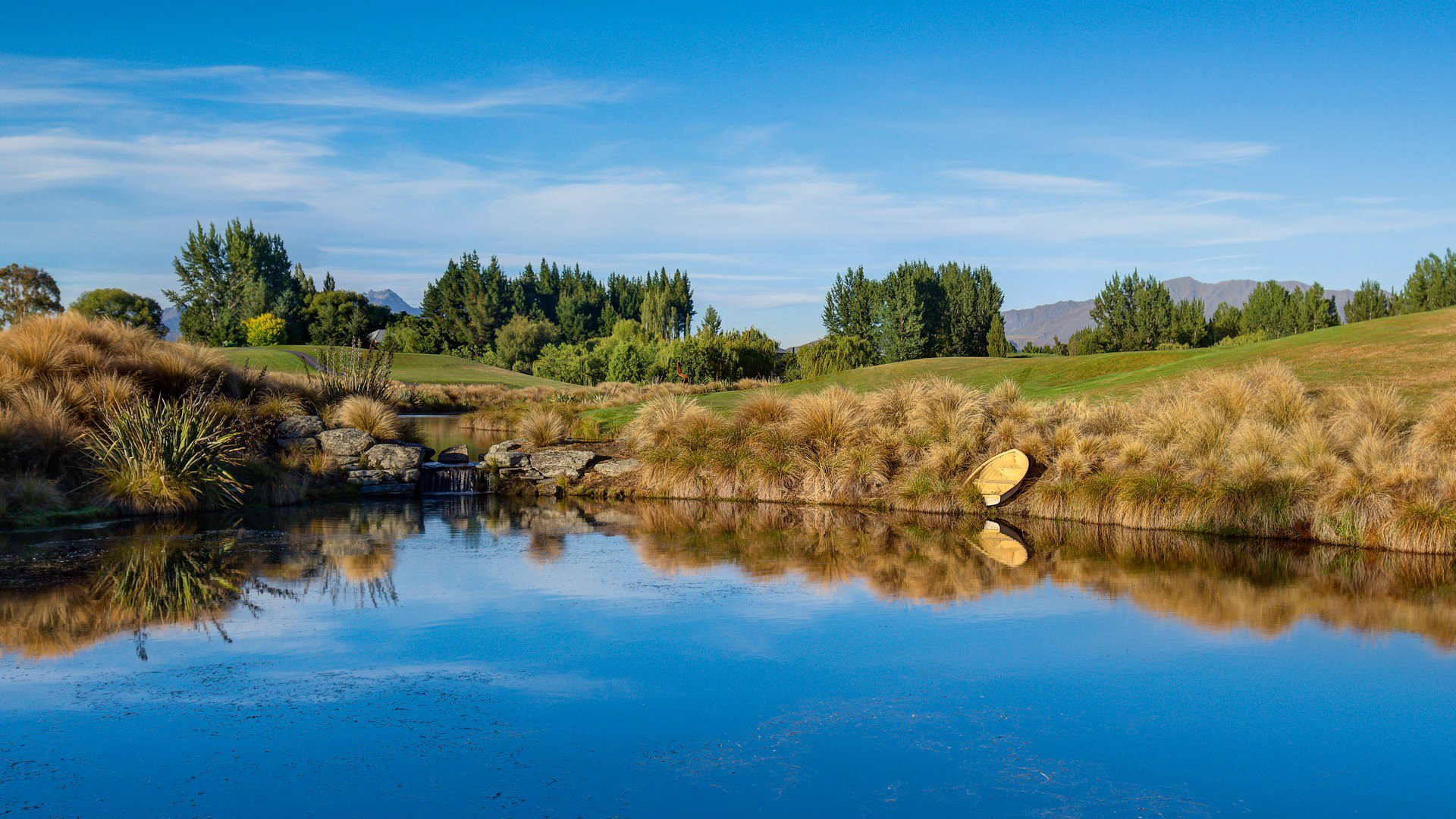 Ludzie siedzą nad jeziorem, w którym pływa duża rybaLudzie siedzą nad jeziorem, w którym pływa duża ryba