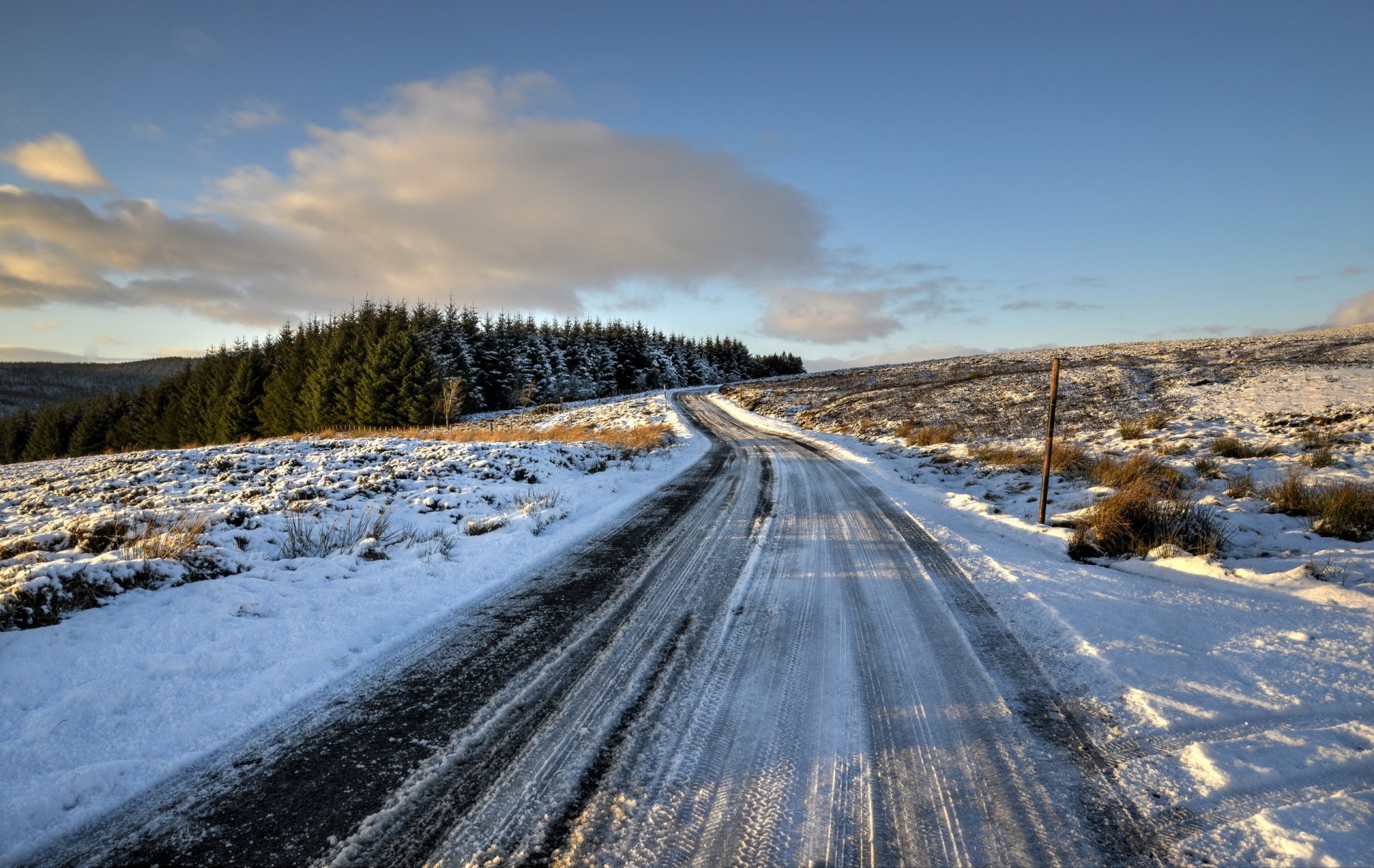Śnieżna droga wśród drzew iglastych