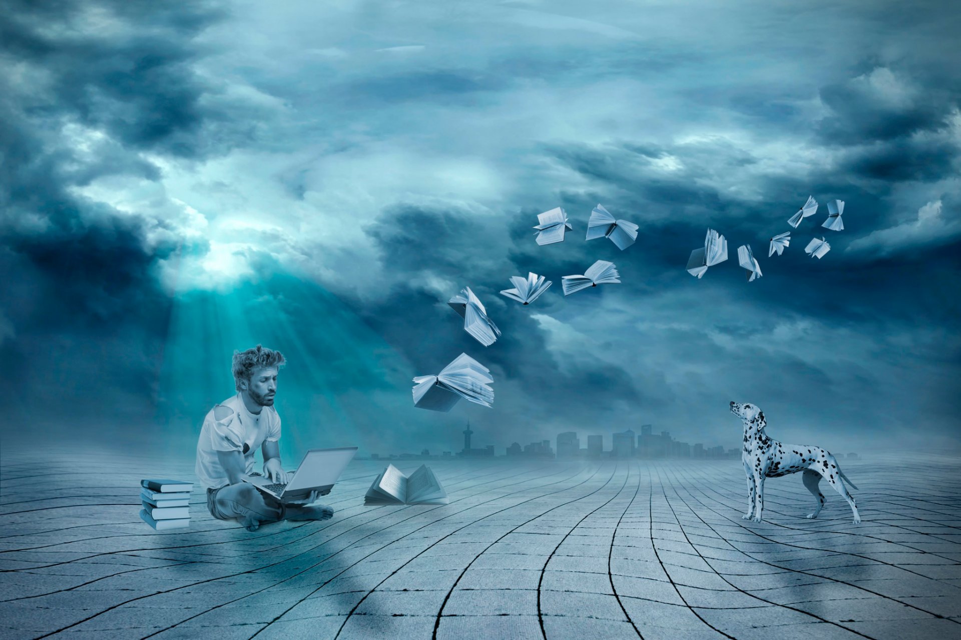 Facet stoi plecami podniósł rękę do góry, pada śnieg, plac puszkina