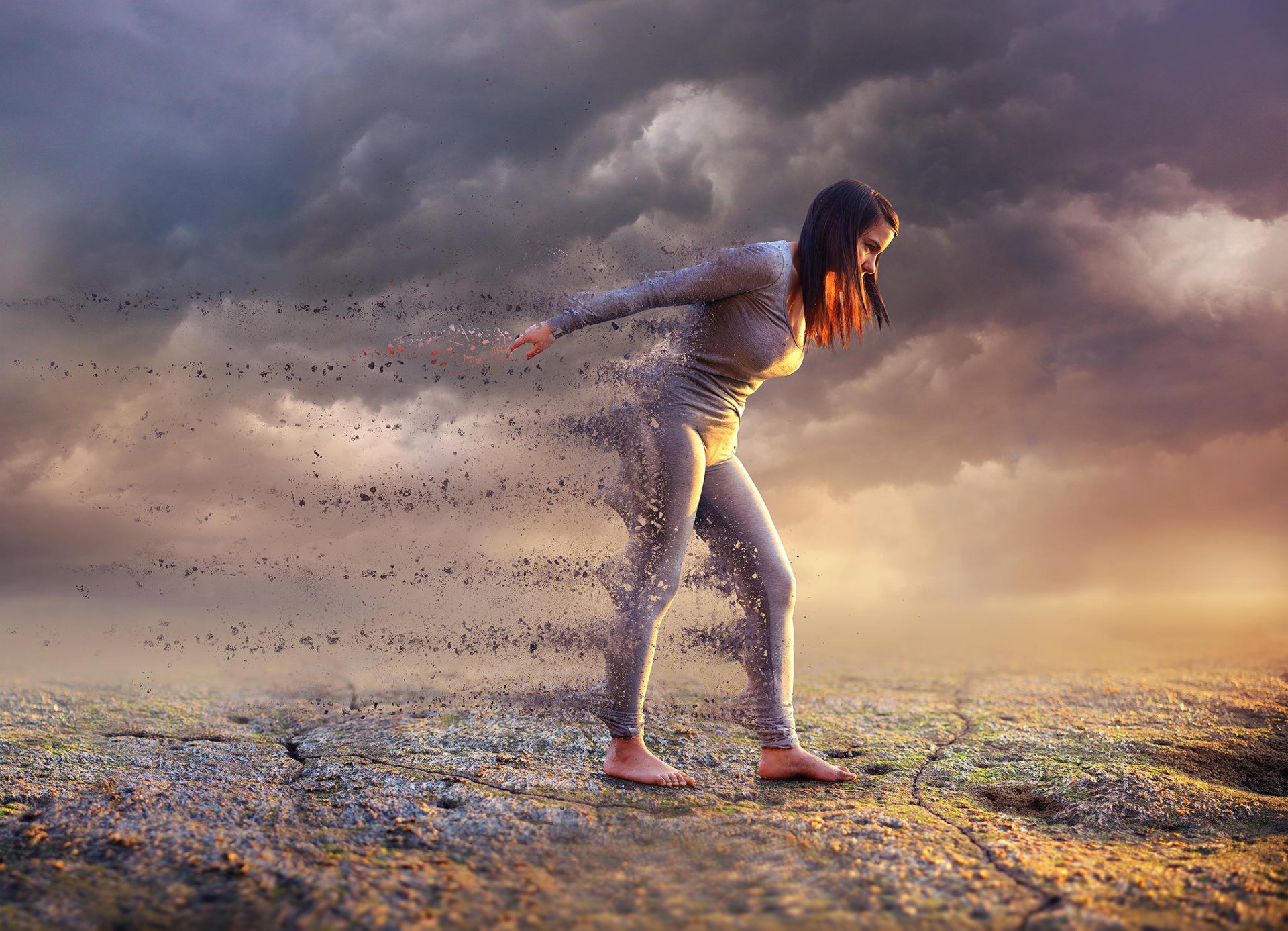 Dziewczyna w trakcie rozpadu na tle szarych chmur