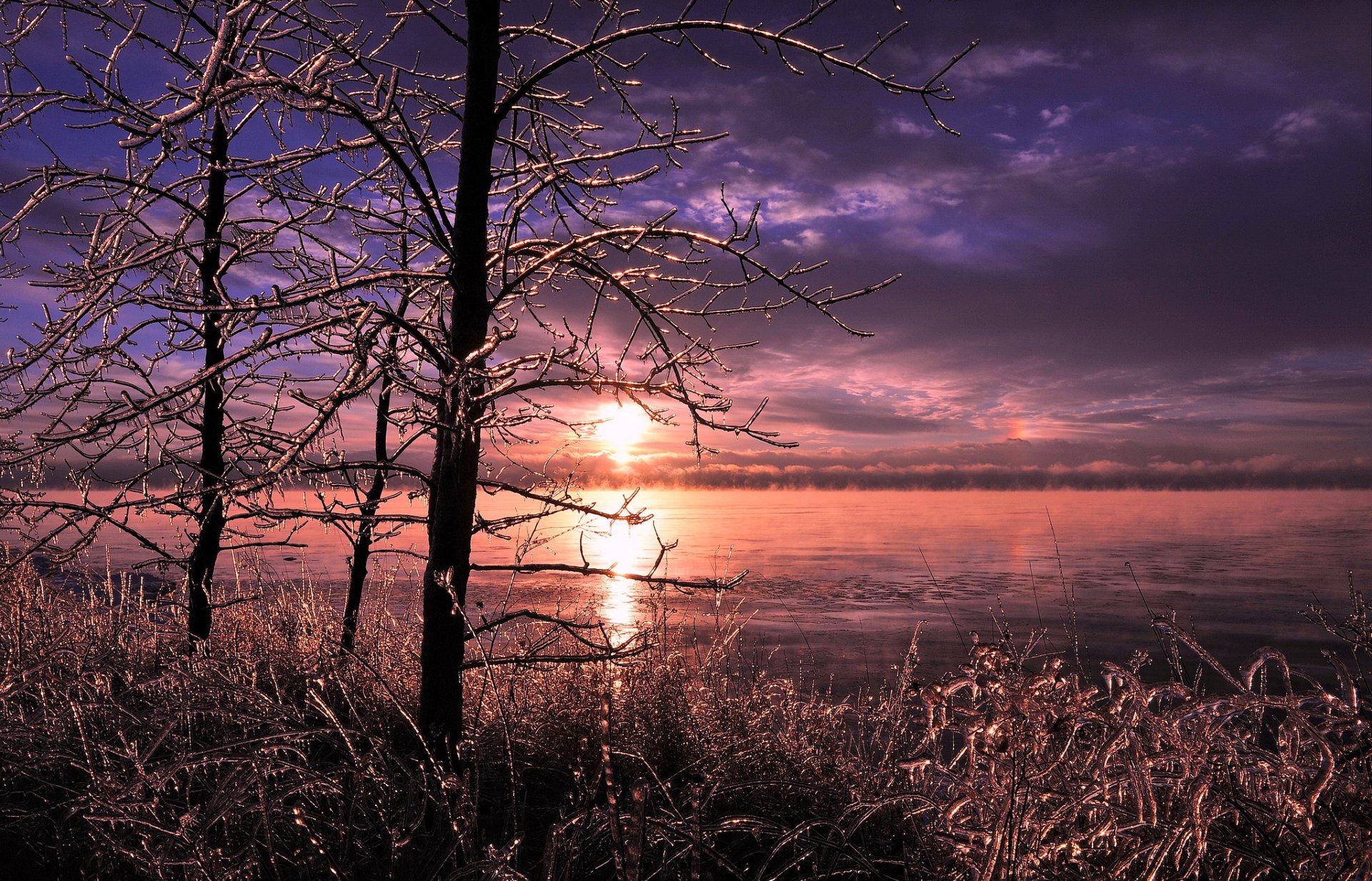 Zachód Słońca w oblodzonym lesie koło jeziora