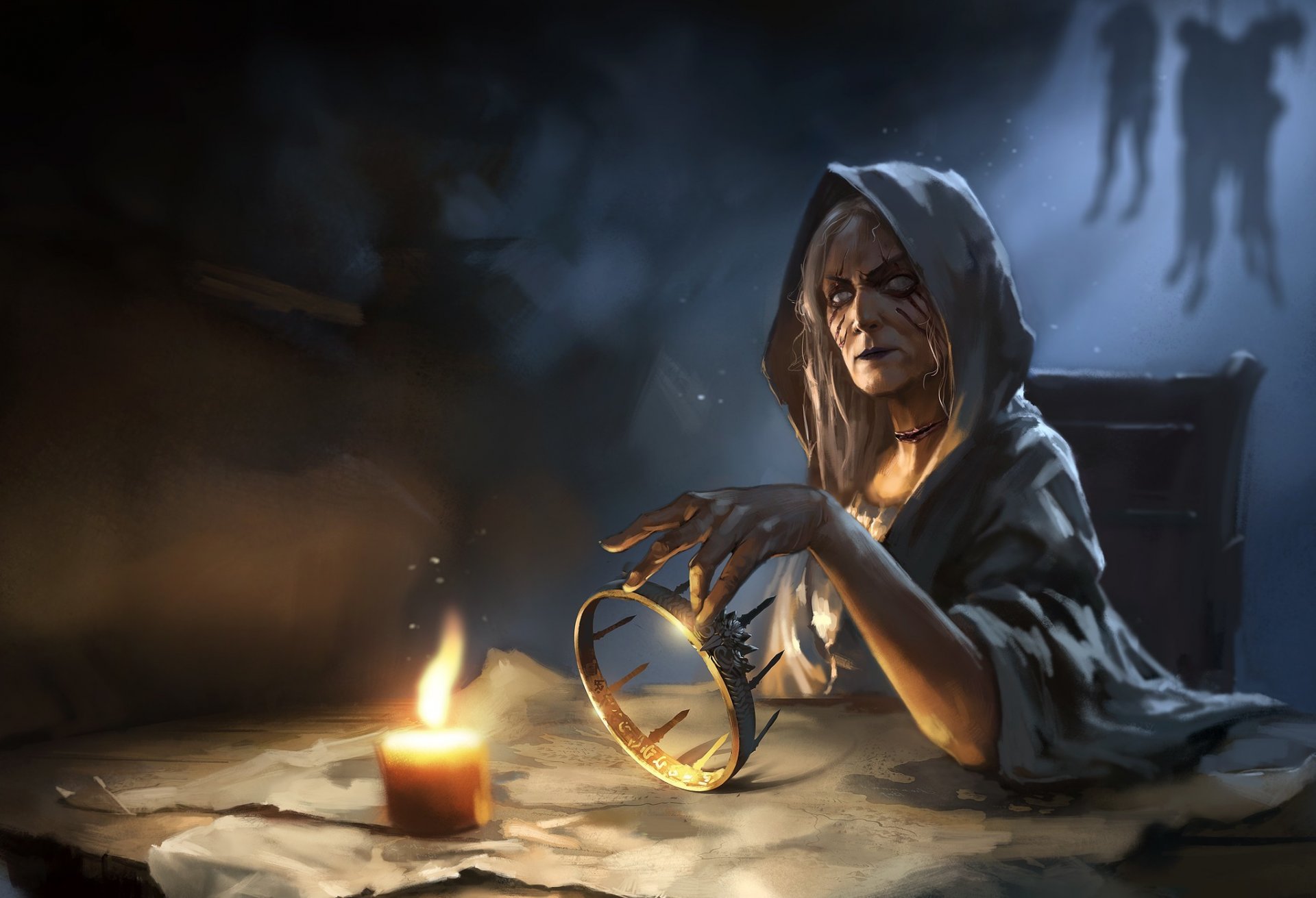 Czarownica czaruje na koronie ze świecami