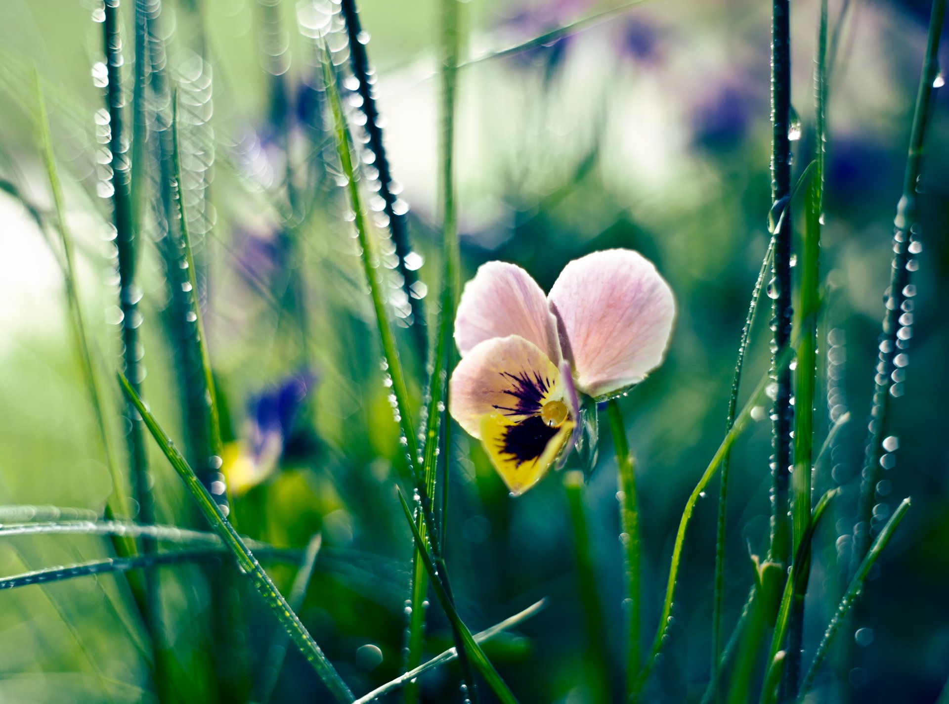 Kwiat Bratek z kroplami rosy w trawie