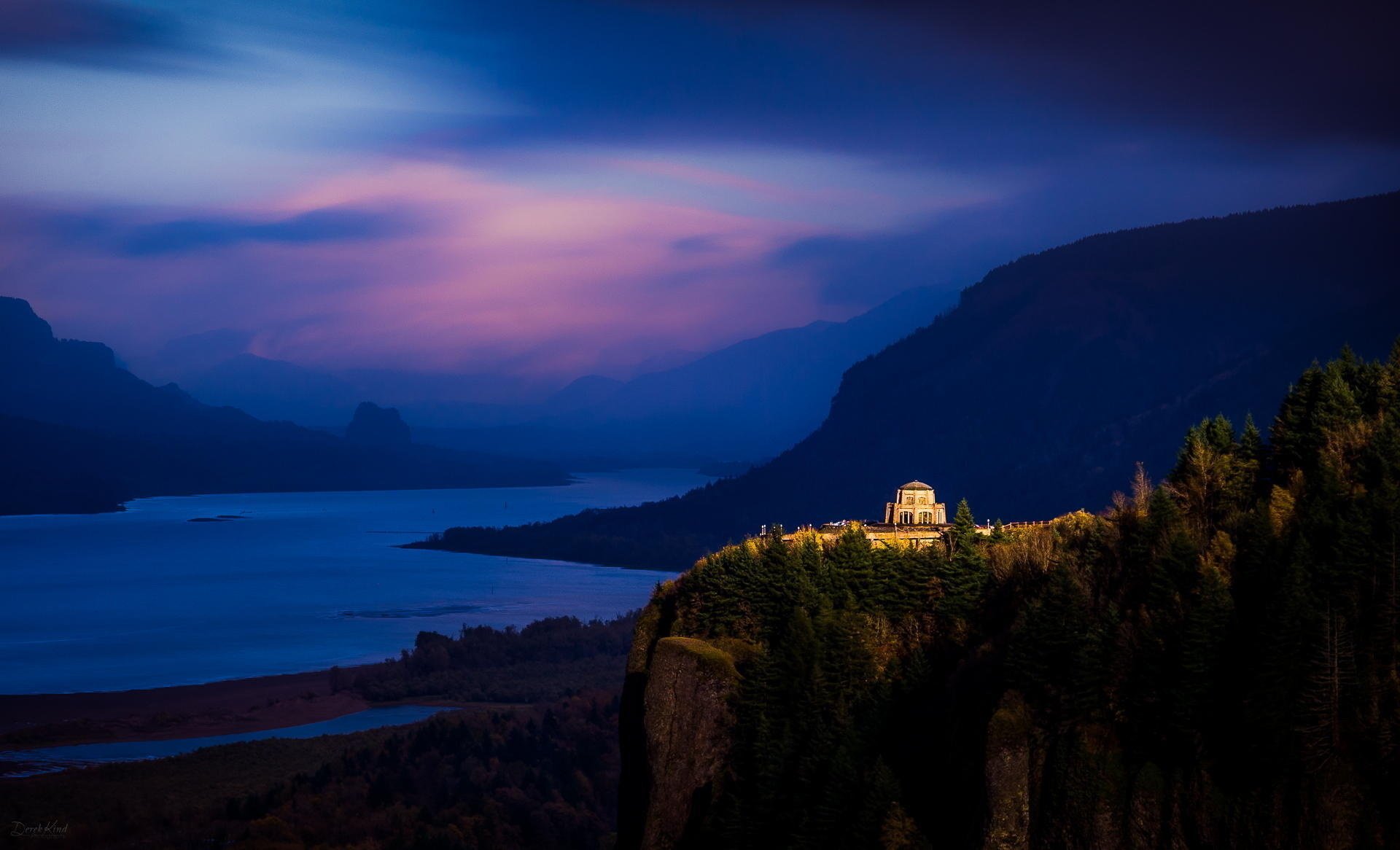 Oświetlona Forteca o zmierzchu fioletowego nieba