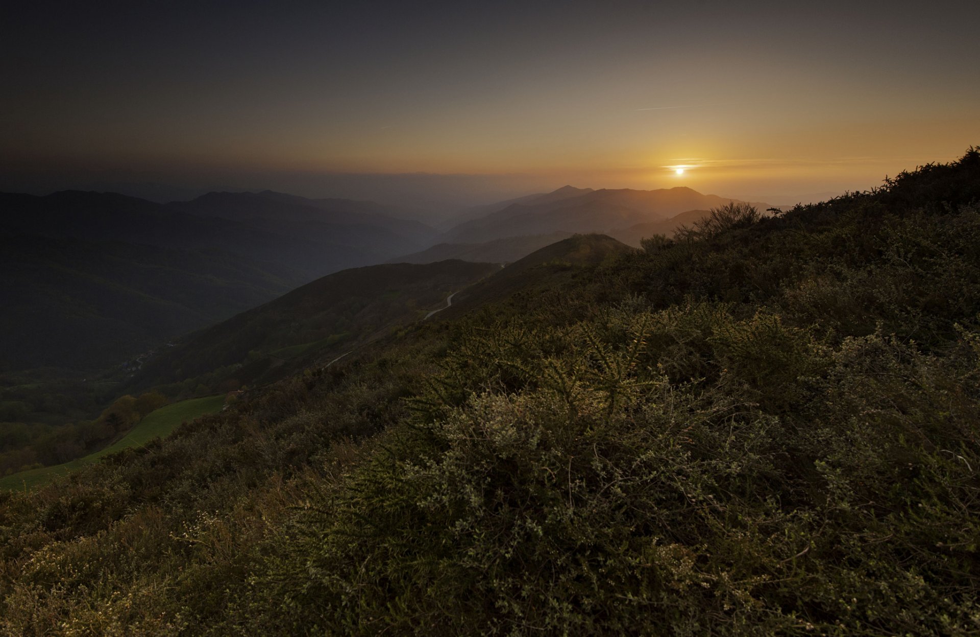 Mgliste pole o zmierzchu pod błękitnym niebem