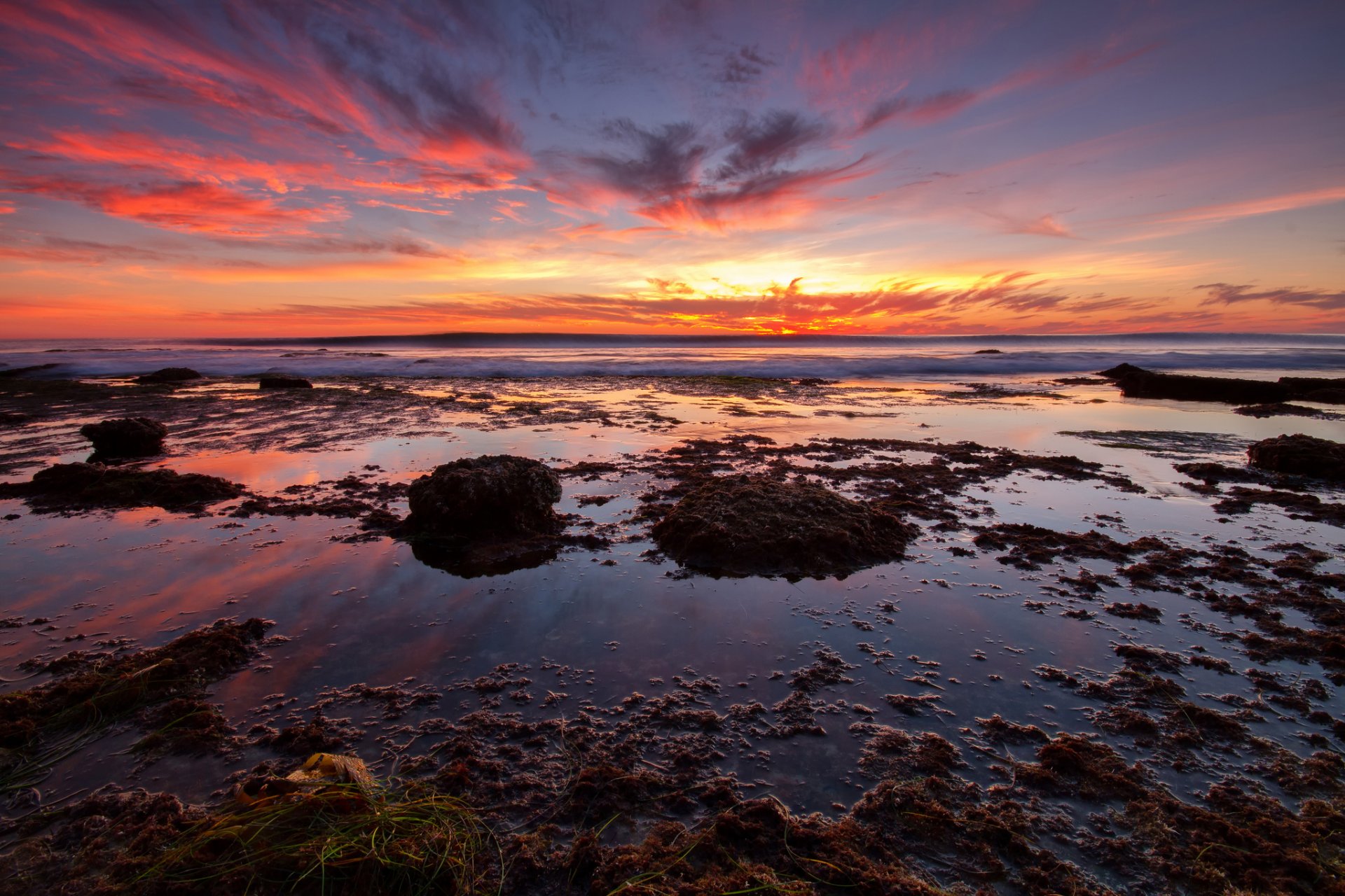Oszałamiający Zachód słońca na wybrzeżu odbija się w morzu