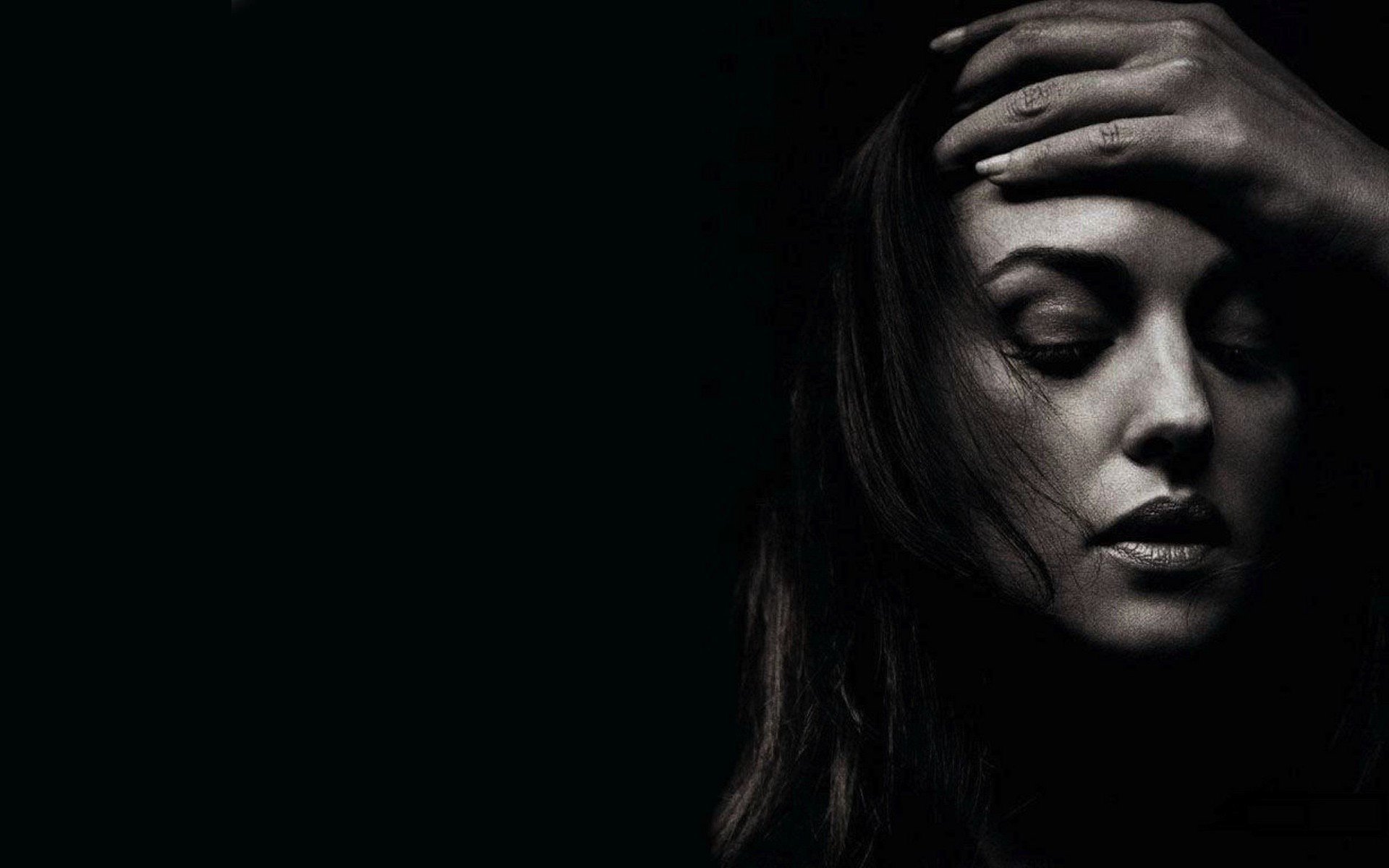 Czarno-białe zdjęcie twarzy aktorki na czarnym tle