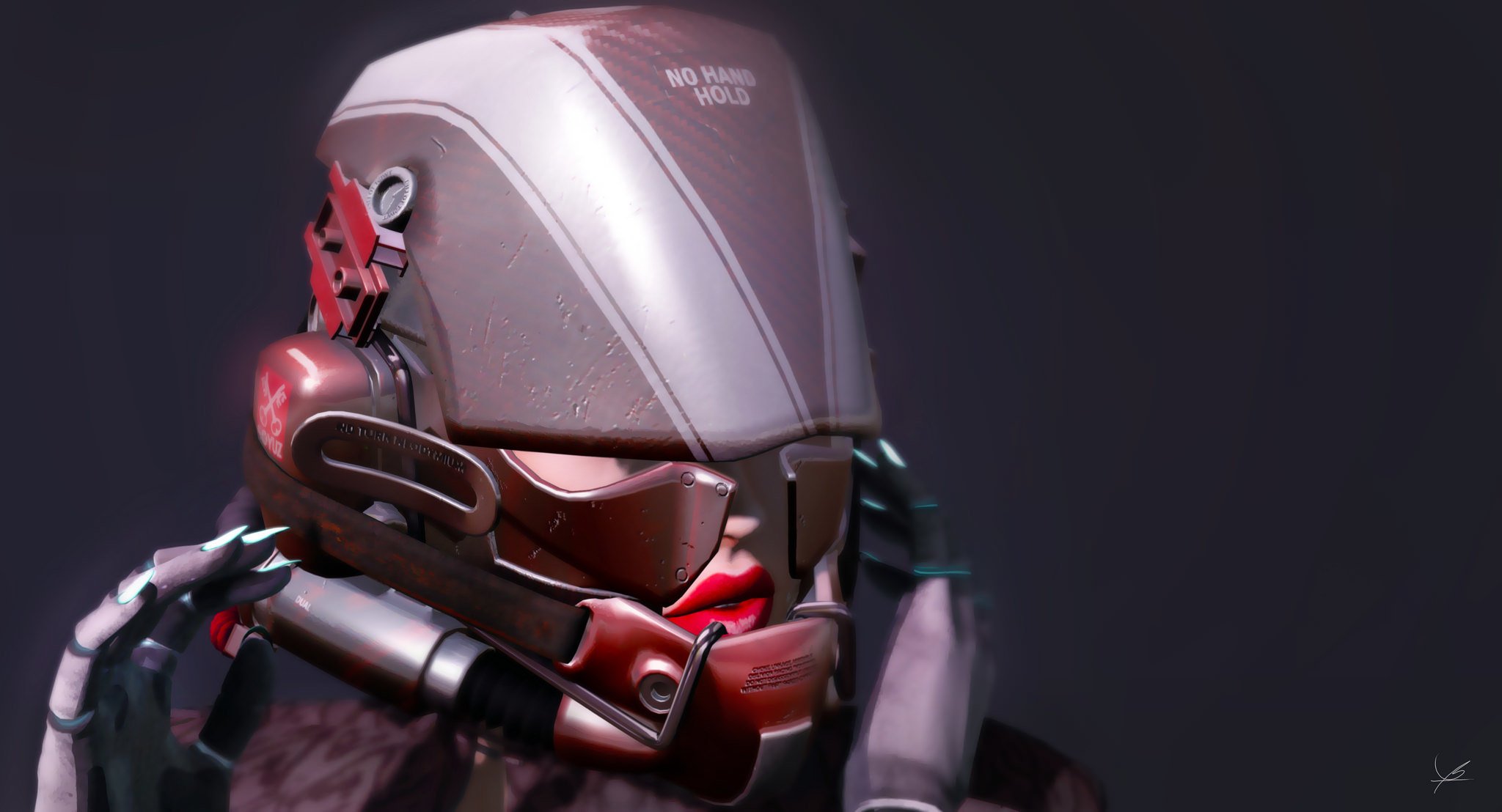 Futurystyczny wizerunek dziewczyny w kasku ze słuchawkamiFuturystyczny wizerunek dziewczyny w kasku ze słuchawkami