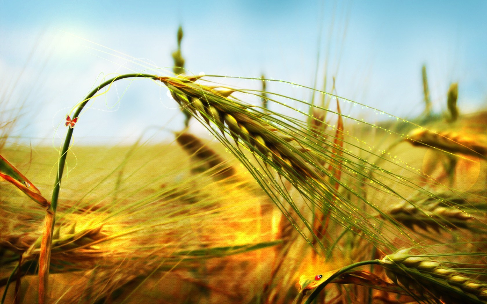 Złote kłosy na tle błękitnego nieba z chmurami