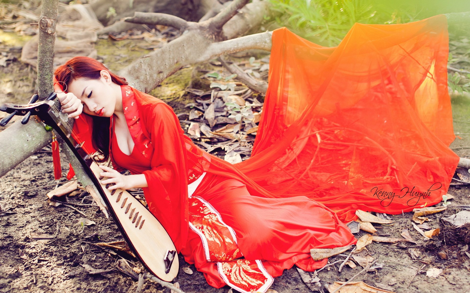 Dziewczyna z płatkami kwiatów w czerwieni na wodzieDziewczyna z płatkami kwiatów w Czerwieni na wodzie
