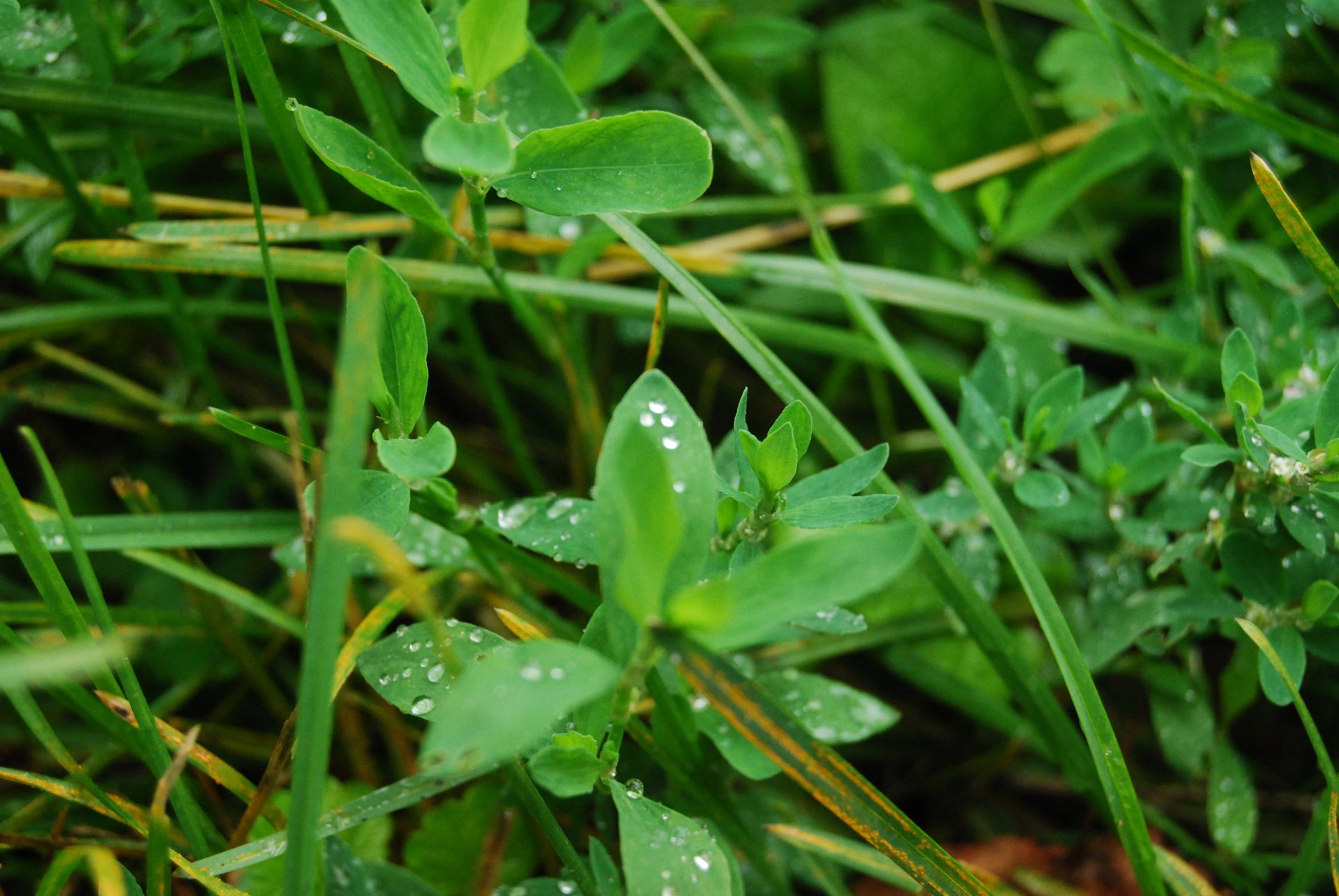Poranna rosa na liściach w trawie