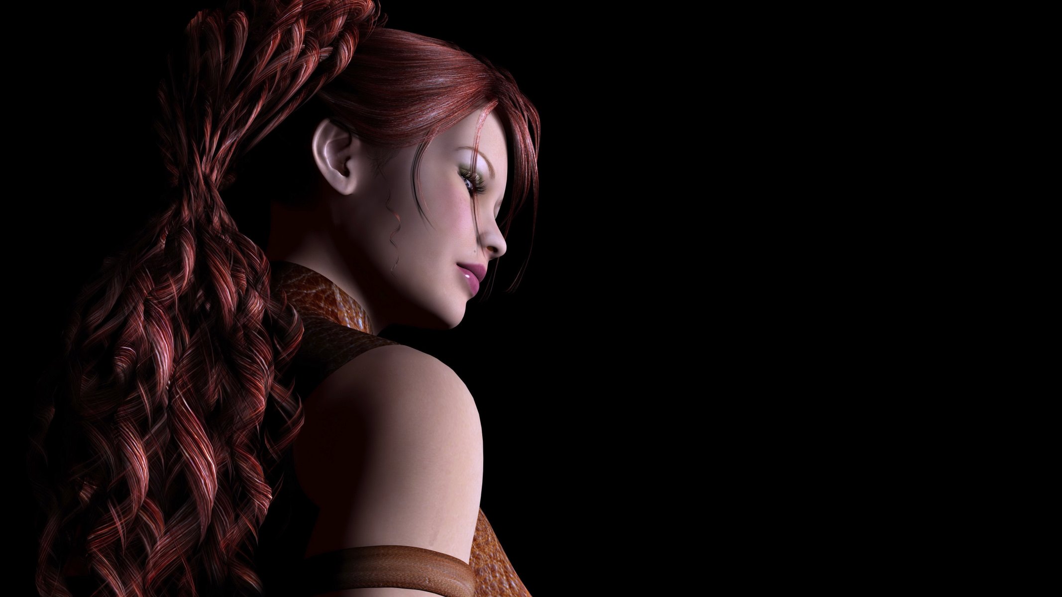 Dziewczyna z długimi, rudymi włosami stoi w profilu na czarnym tle
