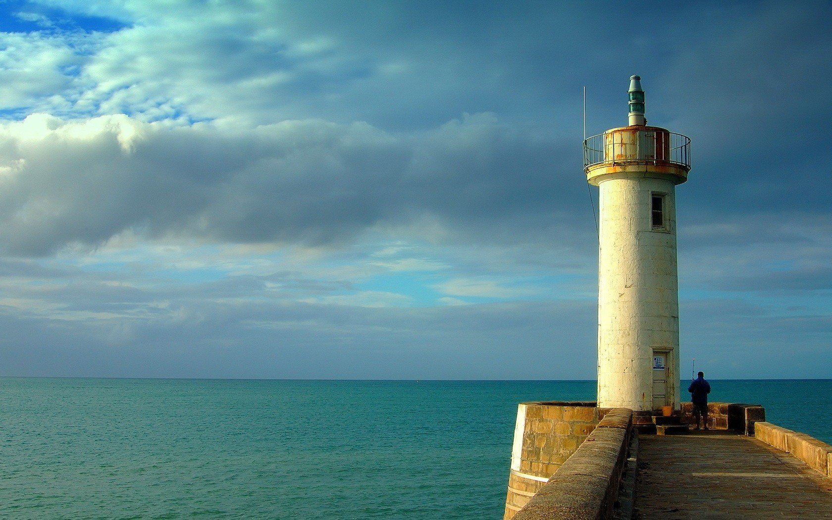 Obraz z wielorybami na niebie. Samotny mężczyzna na brzegu