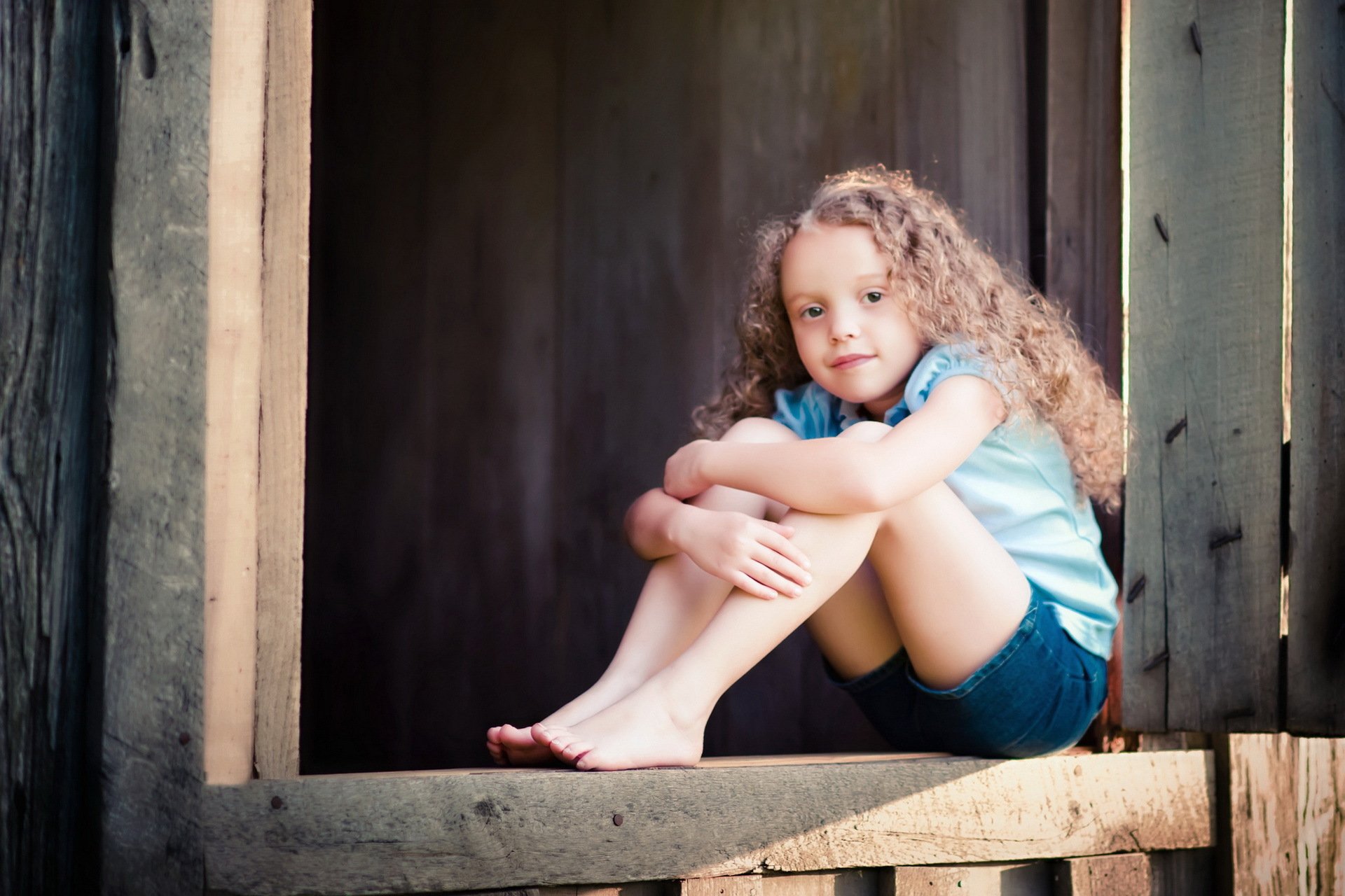 Dziewczyna z kręconymi włosami siedzi na werandzieDziewczyna z kręconymi włosami siedzi na werandzie
