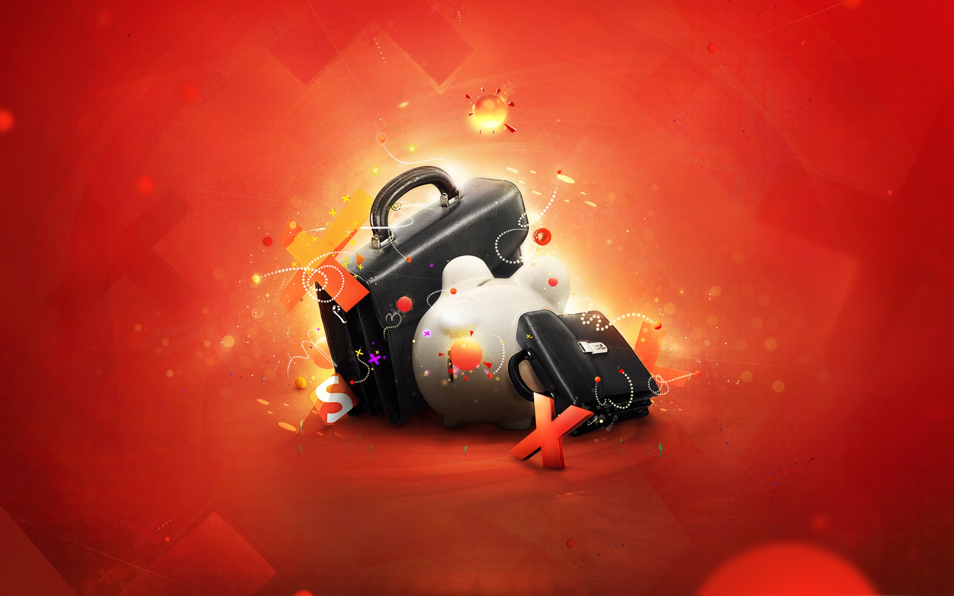 Czarne teczki i biała Skarbonka na czerwonym tle