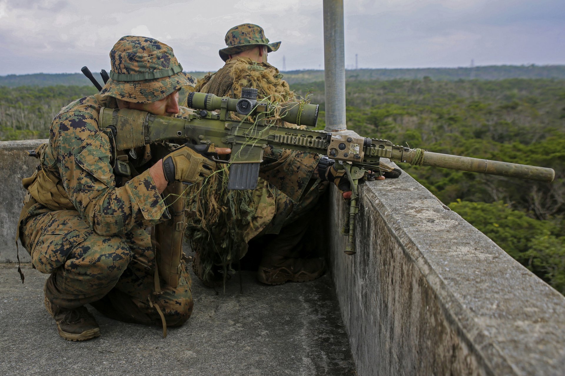 Zamaskowani snajperzy w zasadzce z bronią
