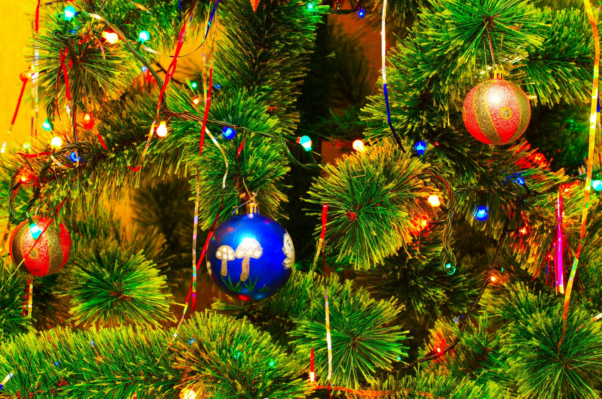 Jasno ubrana choinka z zabawkami na ciemnym tle