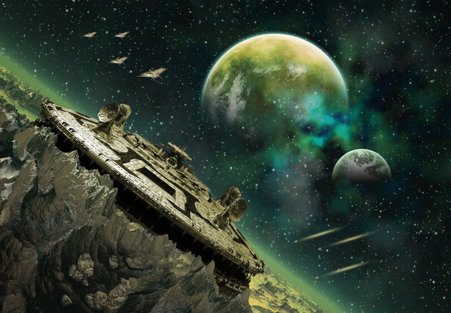 Statek kosmiczny leci w pobliżu planety, która emituje zorzę polarną. pod statkiem odłamki meteorytówStatek kosmiczny leci w pobliżu planety, która emituje zorzę polarną. Pod statkiem odłamki meteorytów