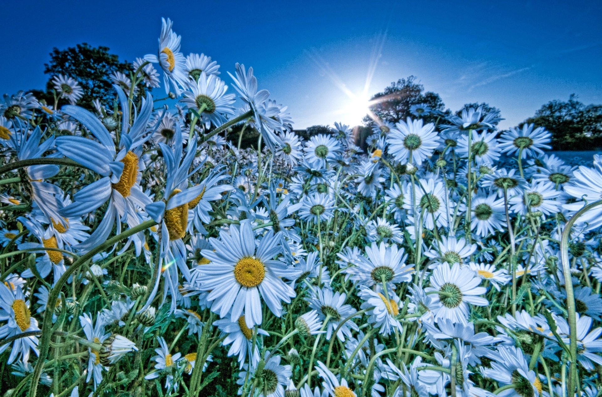Pole stokrotek na tle nieba