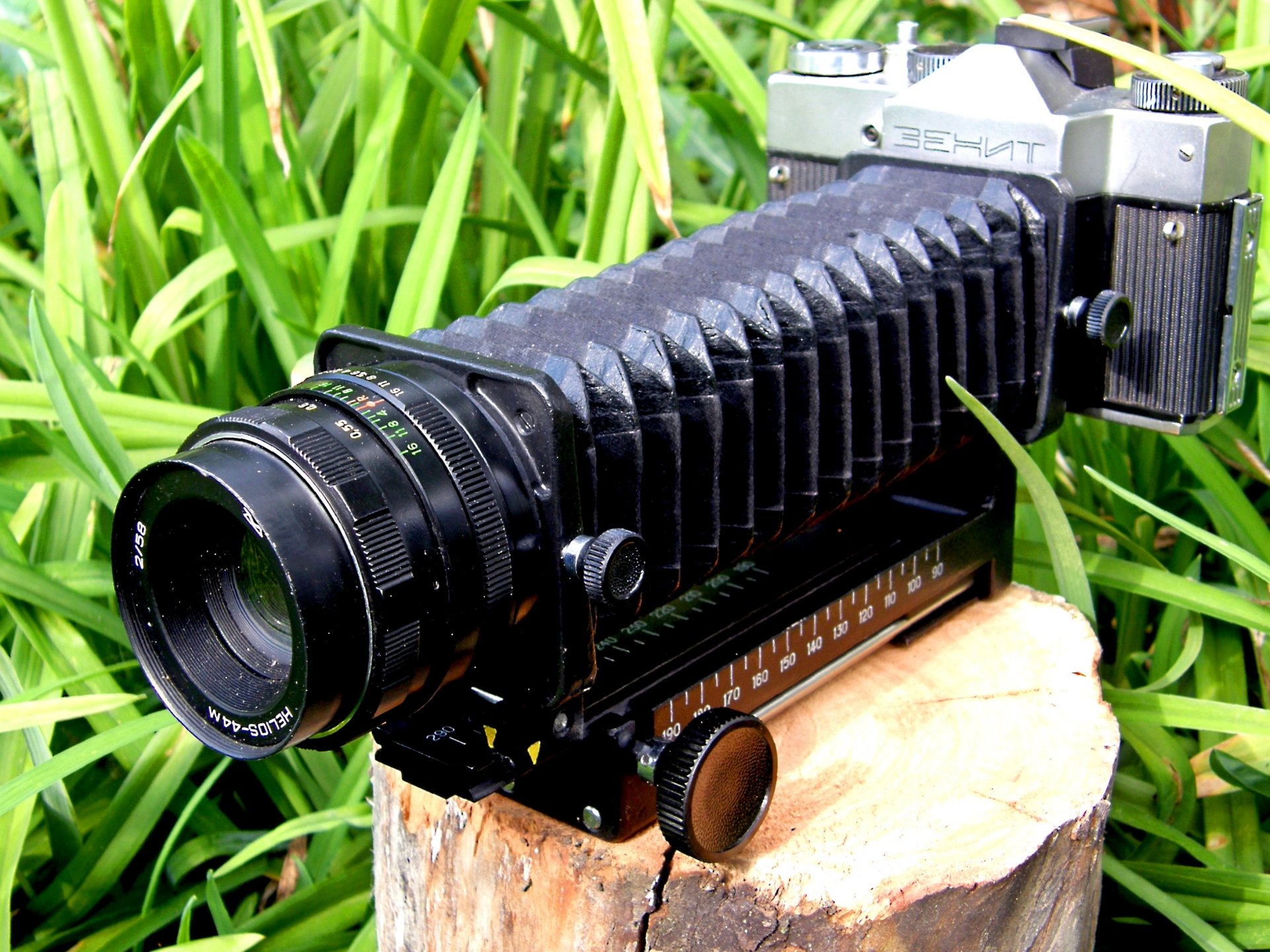 Obiektyw akordeon aparatu zenit na pniu na tle trawyObiektyw Akordeon aparatu Zenit na pniu na tle trawy