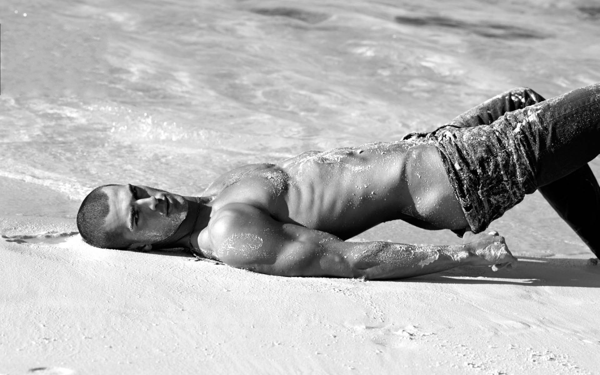 Czarno-białe zdjęcie przystojnego muskularnego faceta w erotycznej pozie na piaskuCzarno-białe zdjęcie przystojnego muskularnego faceta w erotycznej pozie na piasku