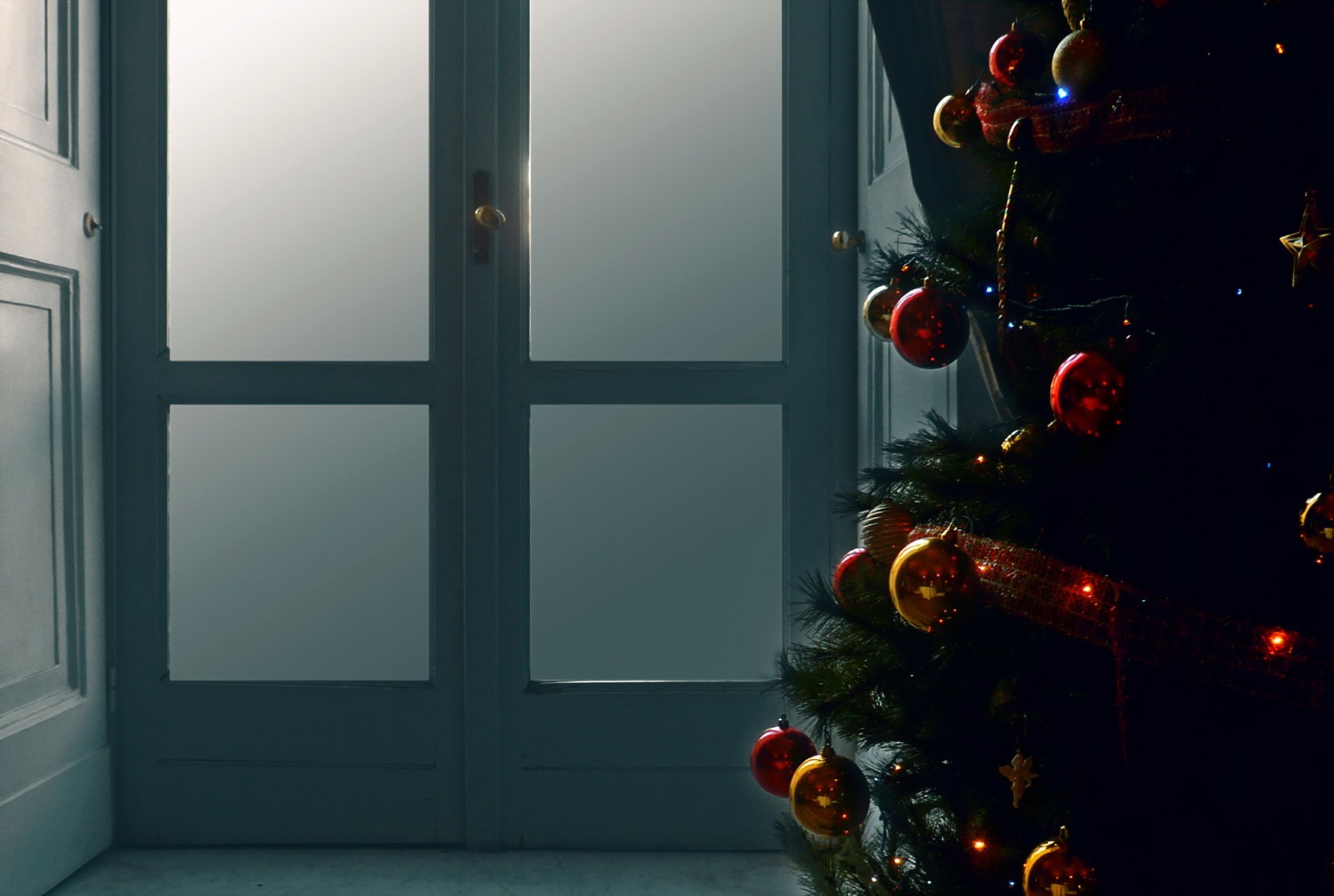 Noc. Choinka z zapalonymi girlandami w mieszkaniu