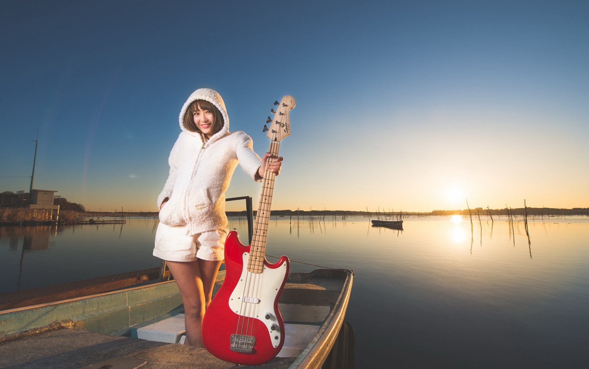 Dziewczyna z czerwoną gitarą na tle zachodu słońcaDziewczyna z czerwoną gitarą na tle zachodu Słońca